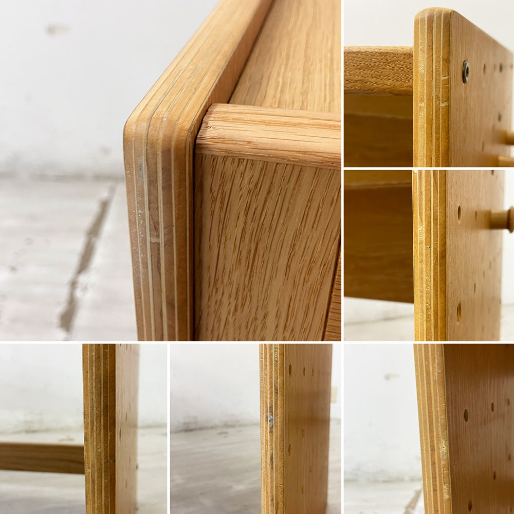 特徴的なフレームのホールを使用し、各パーツごとの位置調整や取外しが可能。天板は木製天板とリノリウム天板によるリバーシブル仕様となり、用途やインテリアのカラーコーディネートに合わせて自由に変更が可能です。