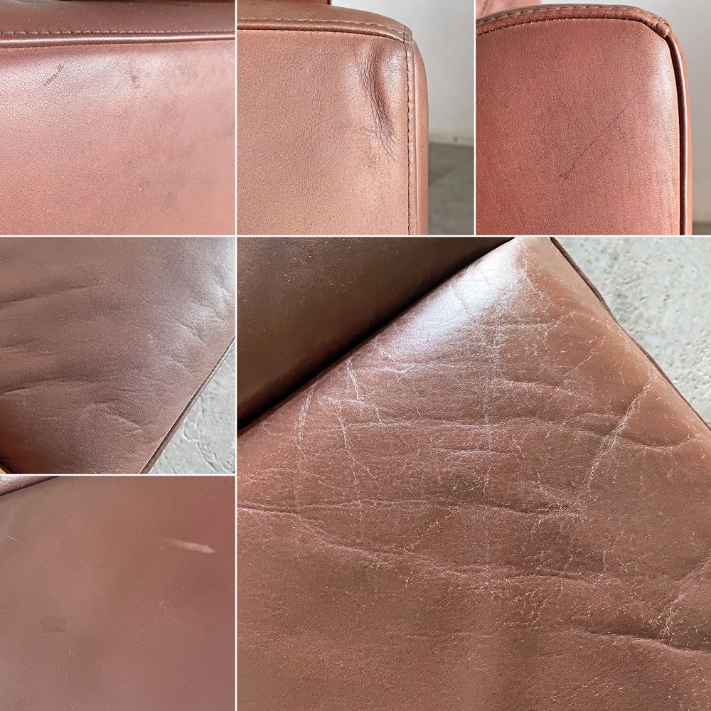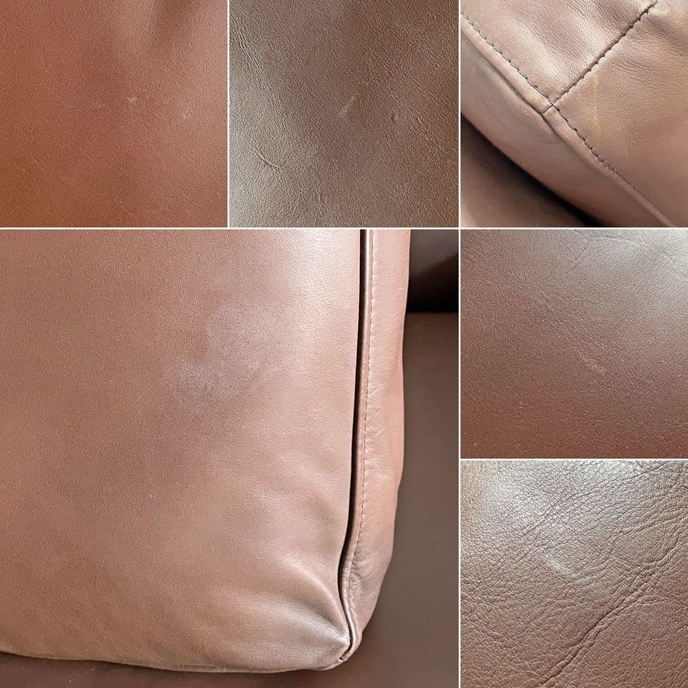 レザーには擦れや傷、黒ずみや白濁汚れが見受けられるとともに、フレーム側面や座面下部を中心にヤケによる色落ちが確認できます。また、カバー内部には革裏の粉状の剥がれがありヌード全体に付着しています。その他、木部表面のひび割れや傷、打痕などはございますが、ご使用に問題となるがたつきやぐらつきといったダメージはございません。レザーの傷みも風合いとしてお楽しみいただきながら、これからも安心して実用いただけるコンディションを保っております。