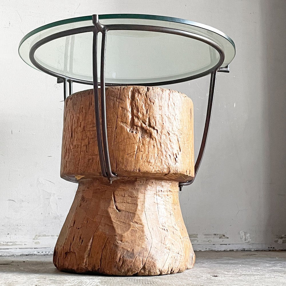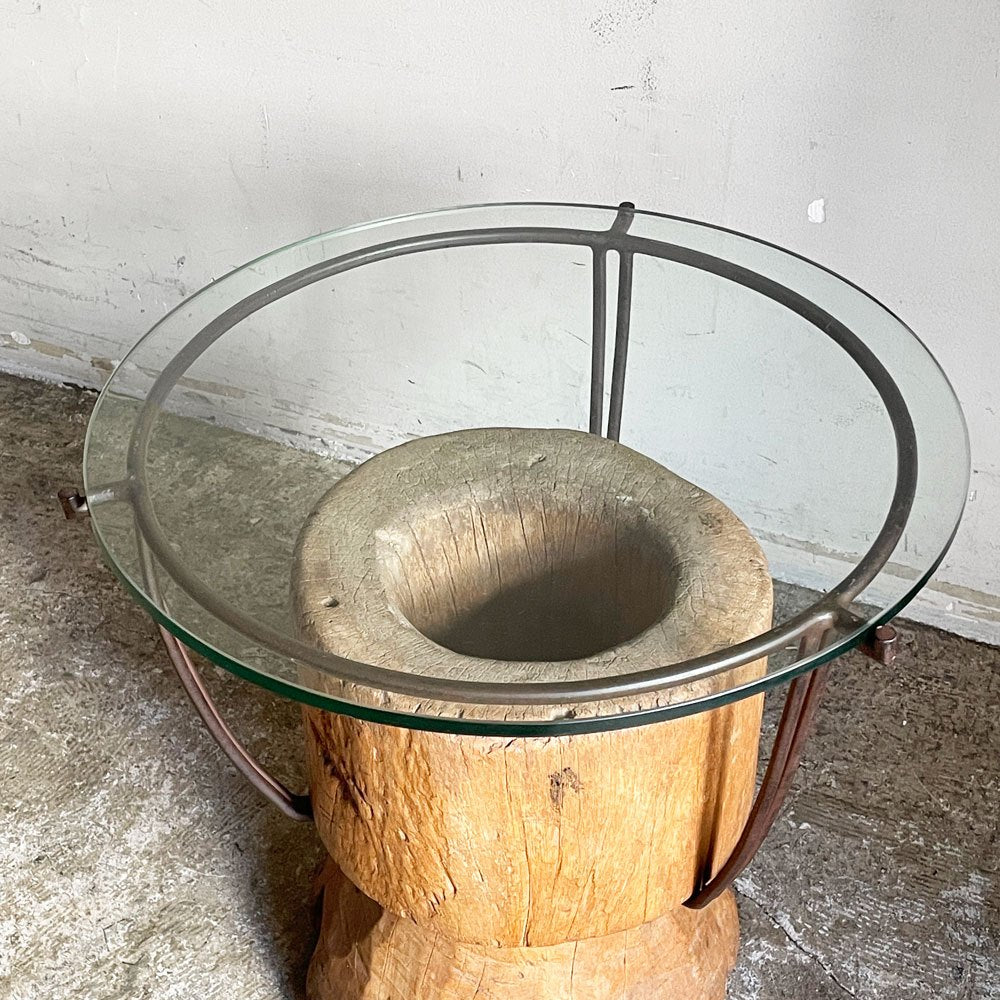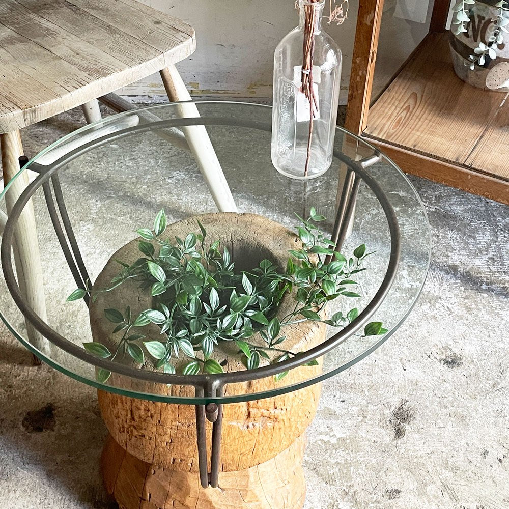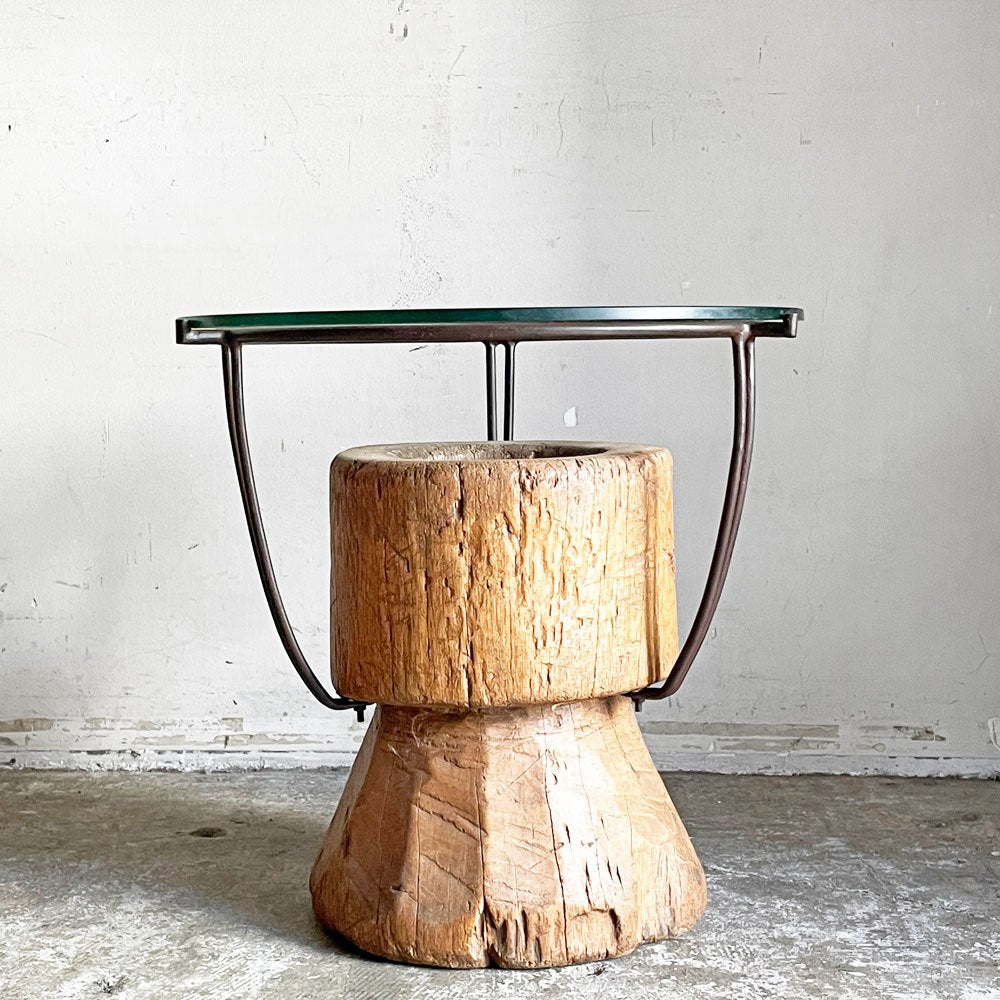 木製の臼にアイアンフレームとガラス天板を組み合わせた、異素材ミックスの一台。