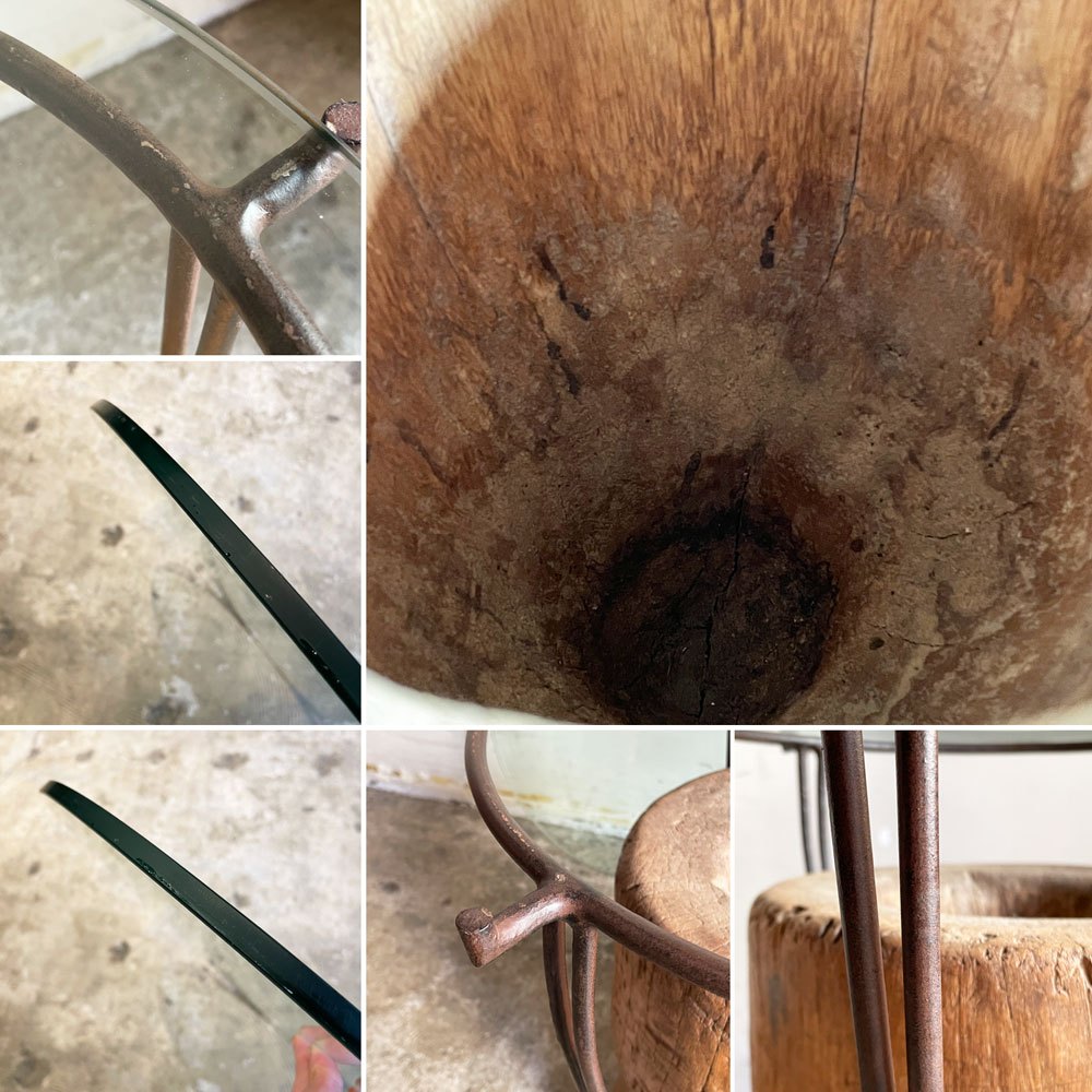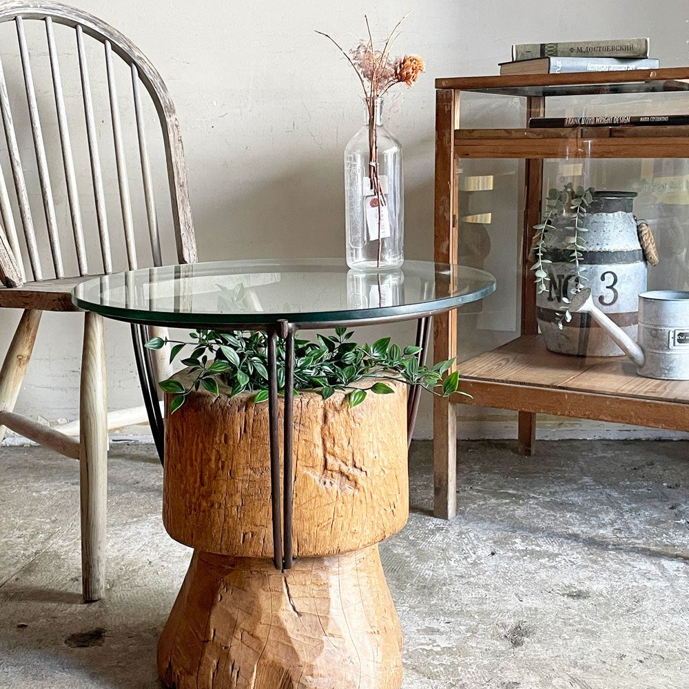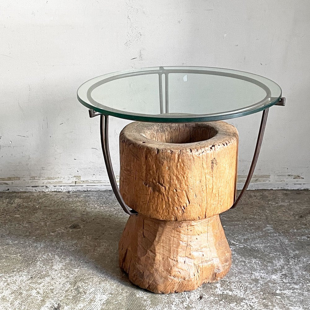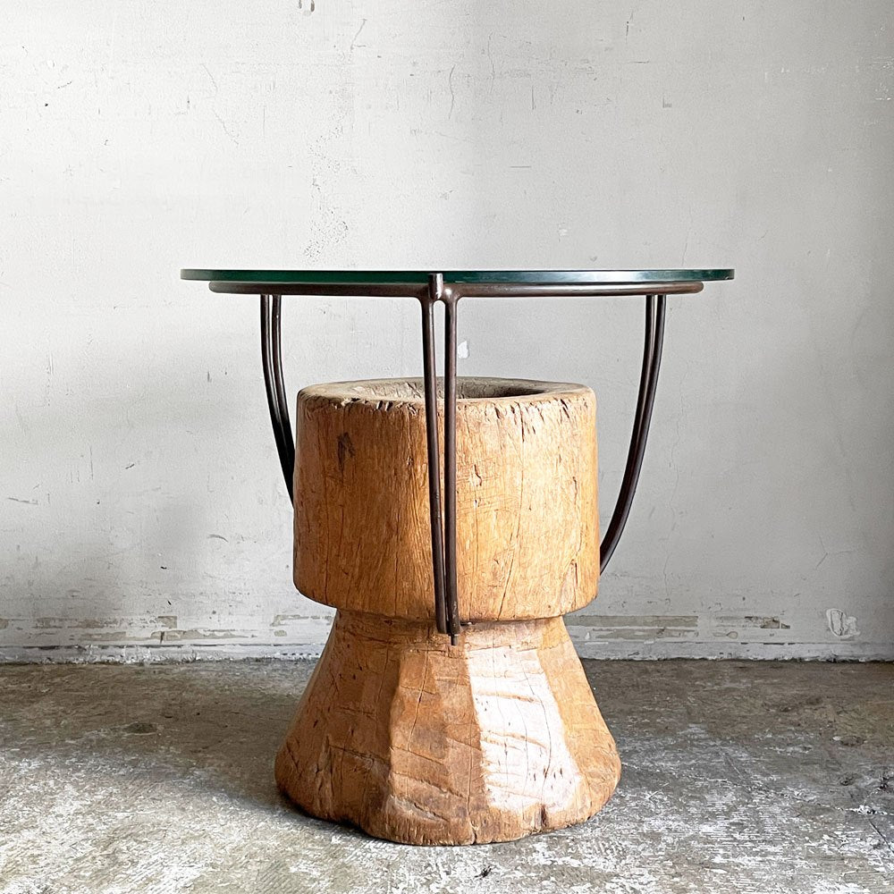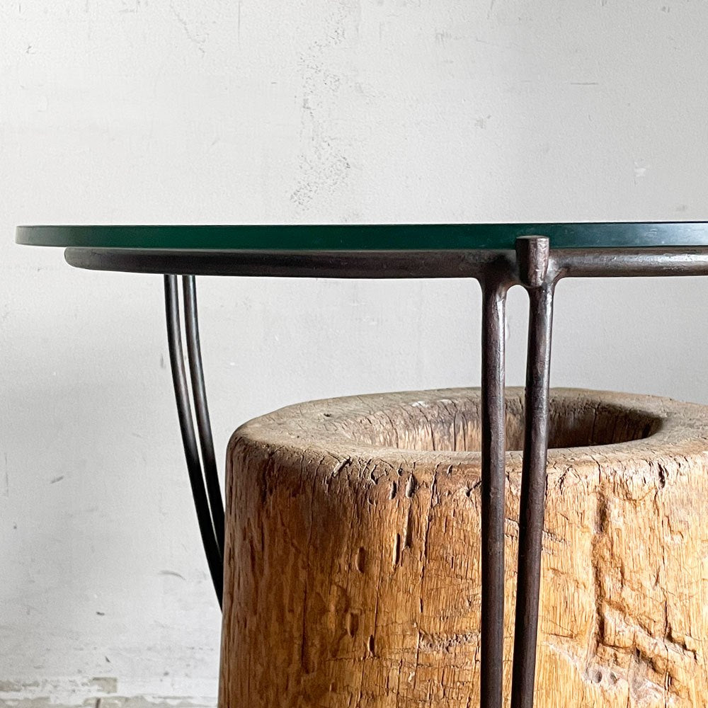 木製の臼にアイアンフレームとガラス天板を組み合わせた、異素材ミックスの一台。