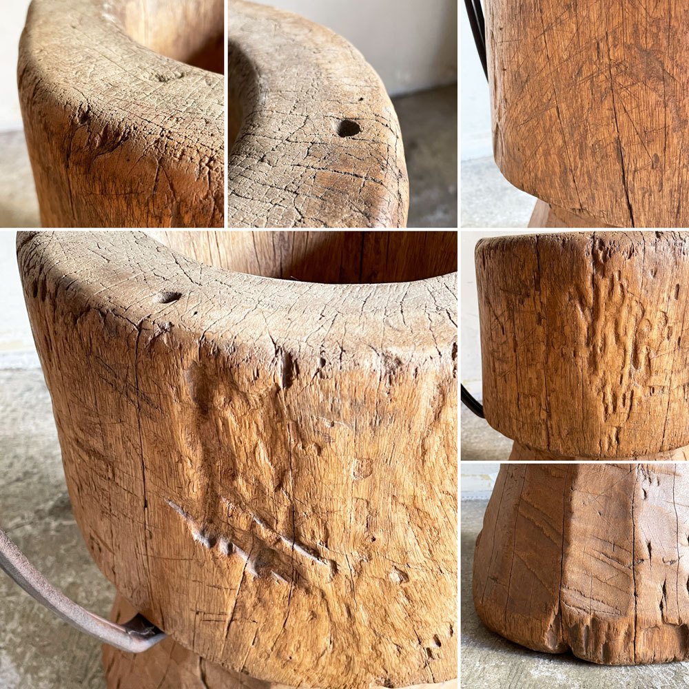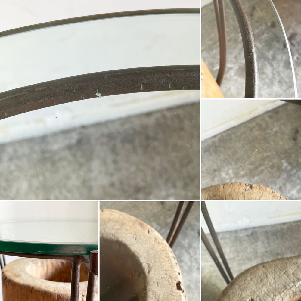 使用に伴い、ガラスには細かな線傷や欠け、アイアンには錆やくすみ、臼には無垢材特有の節や割れ、凹凸などがございます、実用に問題となるダメージはございません。これからも風合いを楽しみながらご使用頂けるコンディションを保っております。