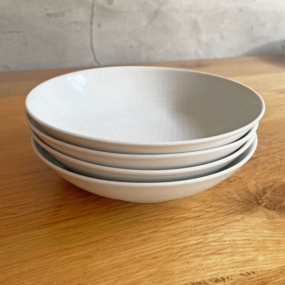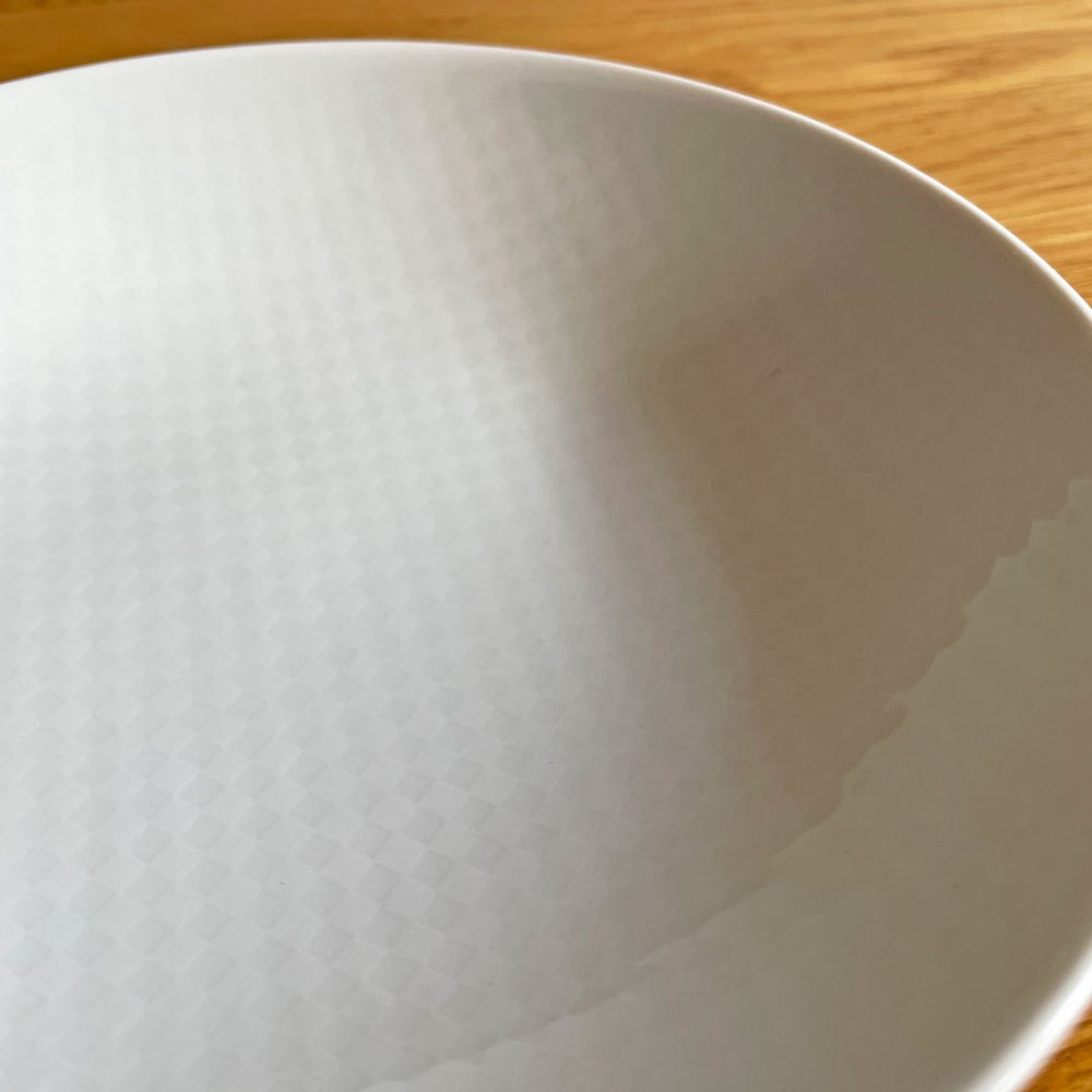 一見シンプルな白磁のプレートに見えますが、光に反射させると格子模様の型押しが浮き彫りになります。