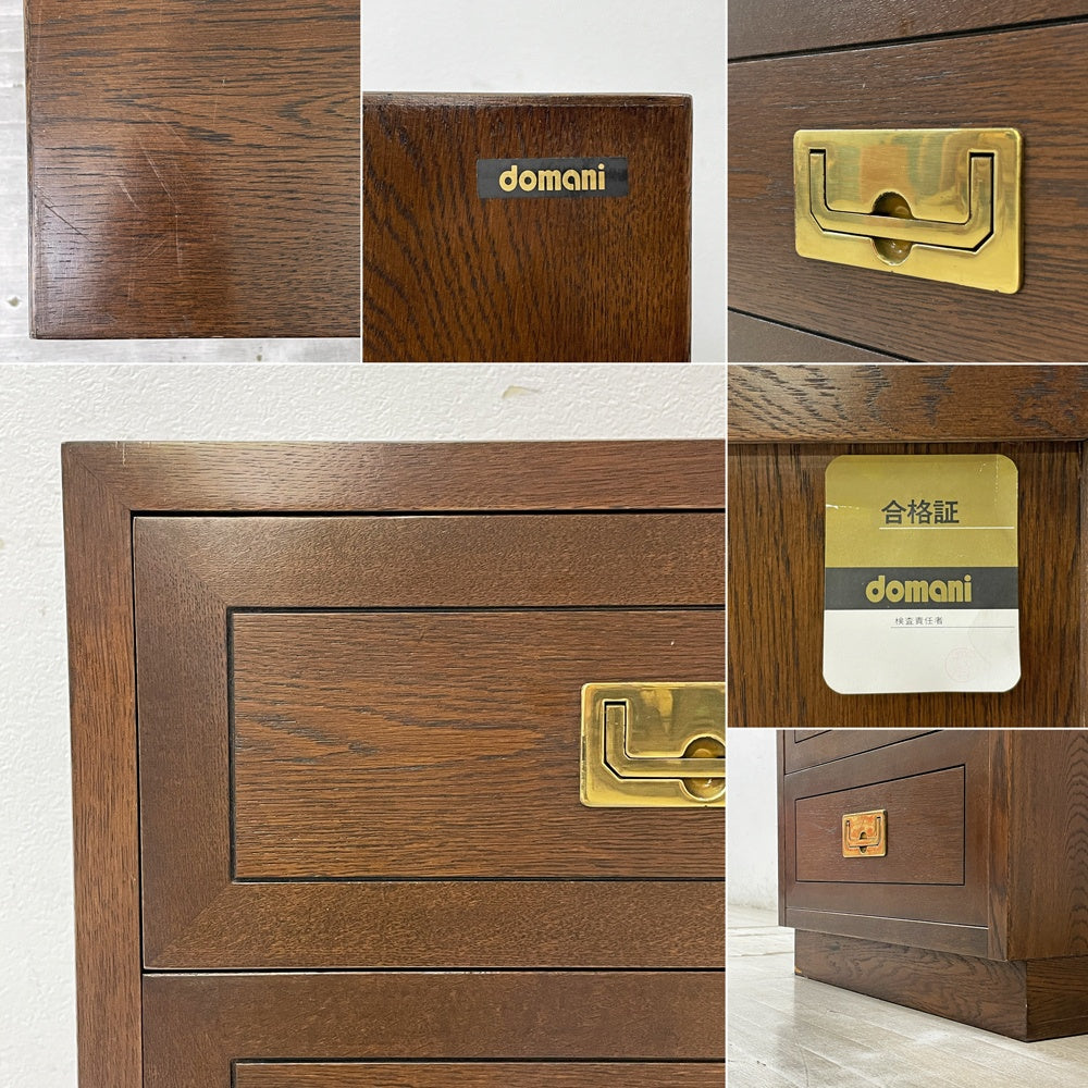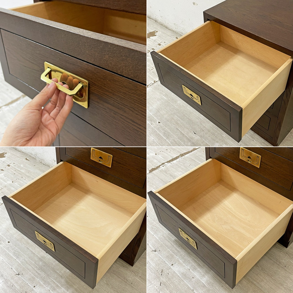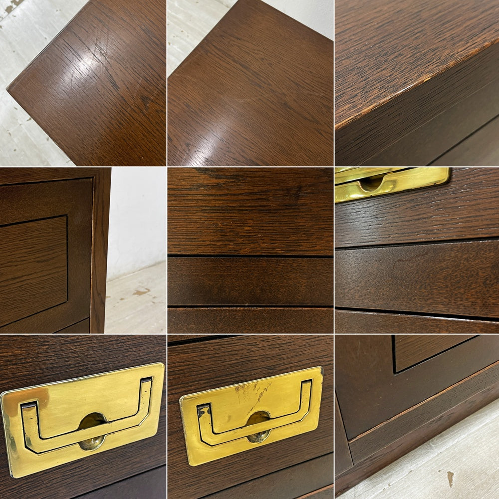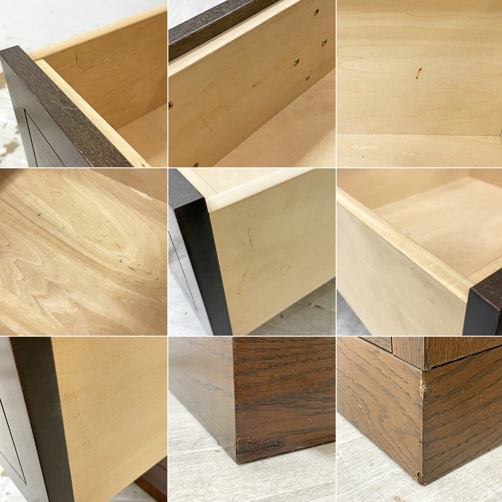 全体に擦れや傷、打痕、突板の剥がれ、ペイントロスや補修ペンによるレタッチ痕が散見され、その他ハンドルのクスミや錆、ドロワー内に落としきれない汚れなどのダメージが散見されます。全体に使用感はございますが、実用に問題となるダメージは無く、これからも安心してご使用いただけるコンディションを保っております。