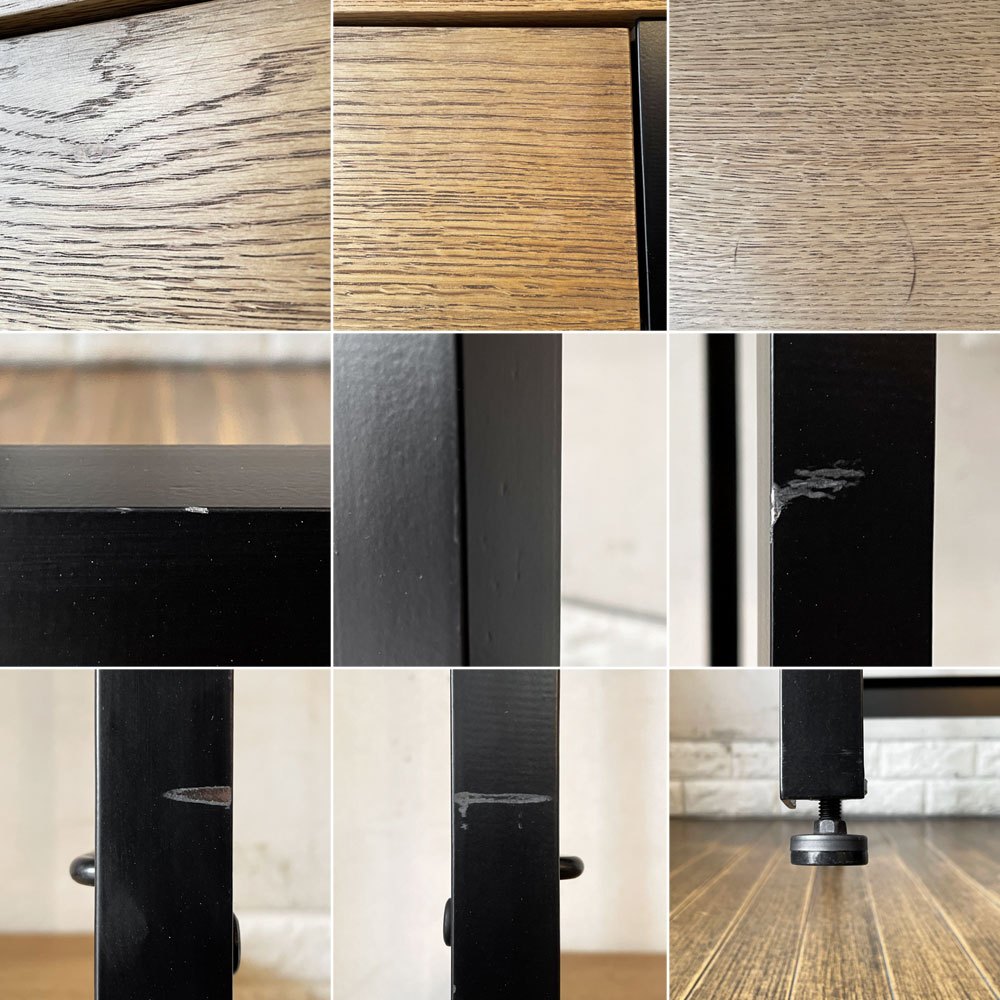 木部には擦れや小傷、縁の小さな欠け、打痕、汚れなどが見受けられます。特に中央の天板の輪染みがやや目立つとともに、抽斗の前面板にうっすらとした白いくすみがございます。またスチールフレームにはペイントロスや擦れ傷、表面塗装のざらつきといった製造痕が散見されます。なお、構造上若干のぐらつきが生じますが、ご使用に問題となるダメージではございません。これからも安心して実用いただけるコンディションを保っております。