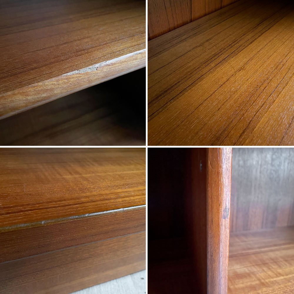 コチラのお品物はビンテージ品となります。使用・経年に伴う傷や擦れ、色ムラやペイントロス、棚板の設置による日焼け痕、軽微な突板の剥がれや取り切れない汚れなどがございます。また、底板と背板のとの間に若干の隙間が生じている箇所がございますが、大きく美観を損なうようなダメージなども無く、ご使用に問題のある箇所などもございません。ビンテージ品として概ね良好なコンディションを保っております。