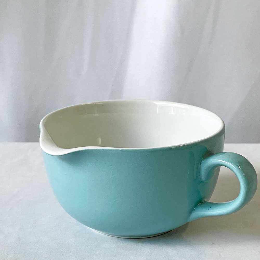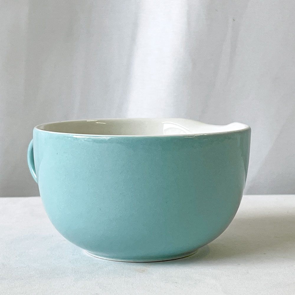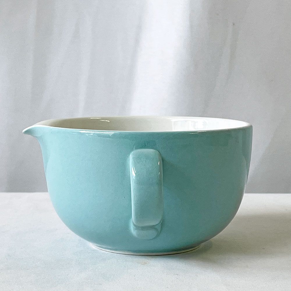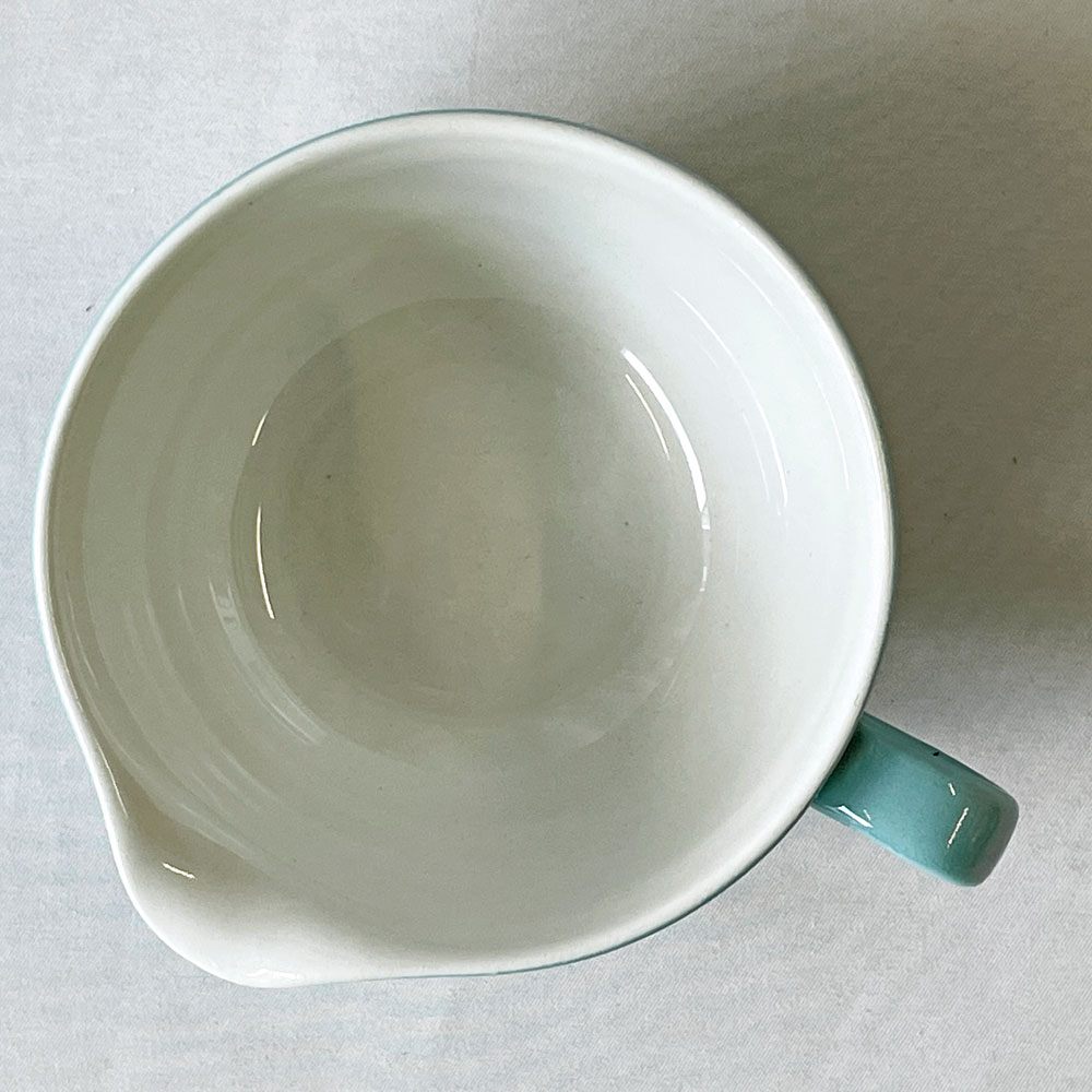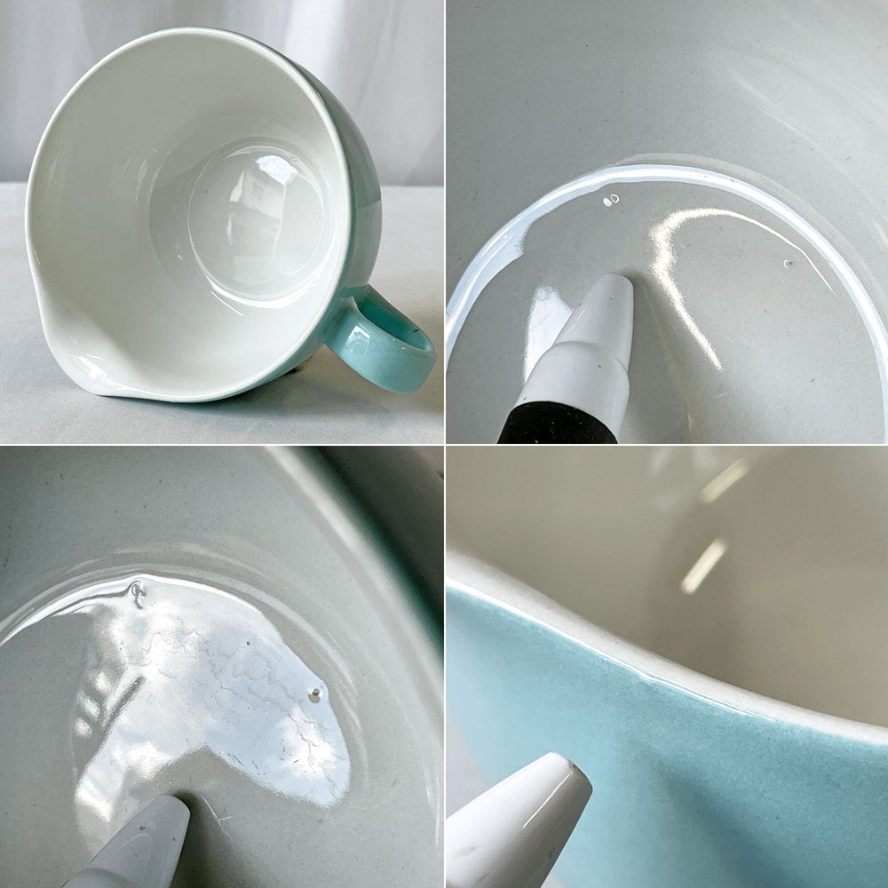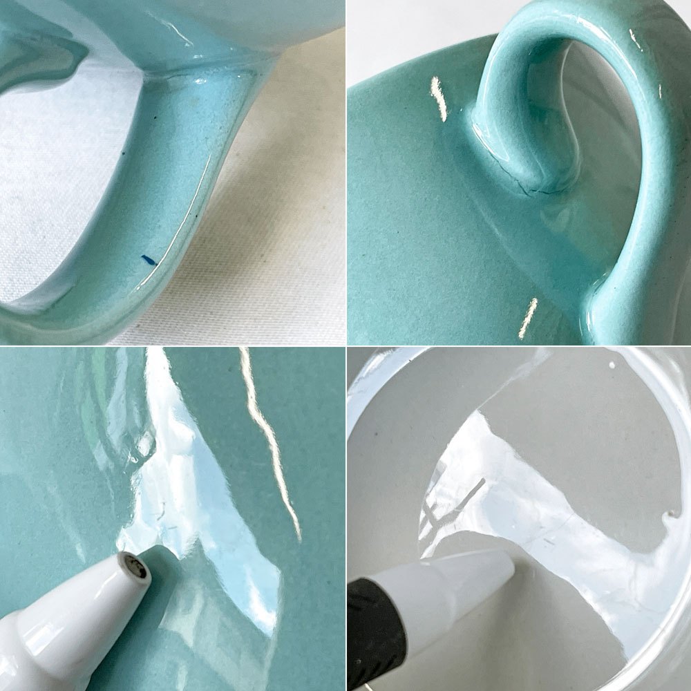 こちらはビンテージ品となります。使用に伴う擦れ傷の他、小傷や着色、スポットや釉薬ムラなどはございますが、いずれも大きく目立つものではございません。ほかハンドル付近に焼成時のものと思われるヒビの様なものが見受けられますが、ご実用に大きな影響は無いものと思われます。引き続き雰囲気を楽しみながらお使い頂けるビンテージ品として概ね良好なコンディションを保っております。