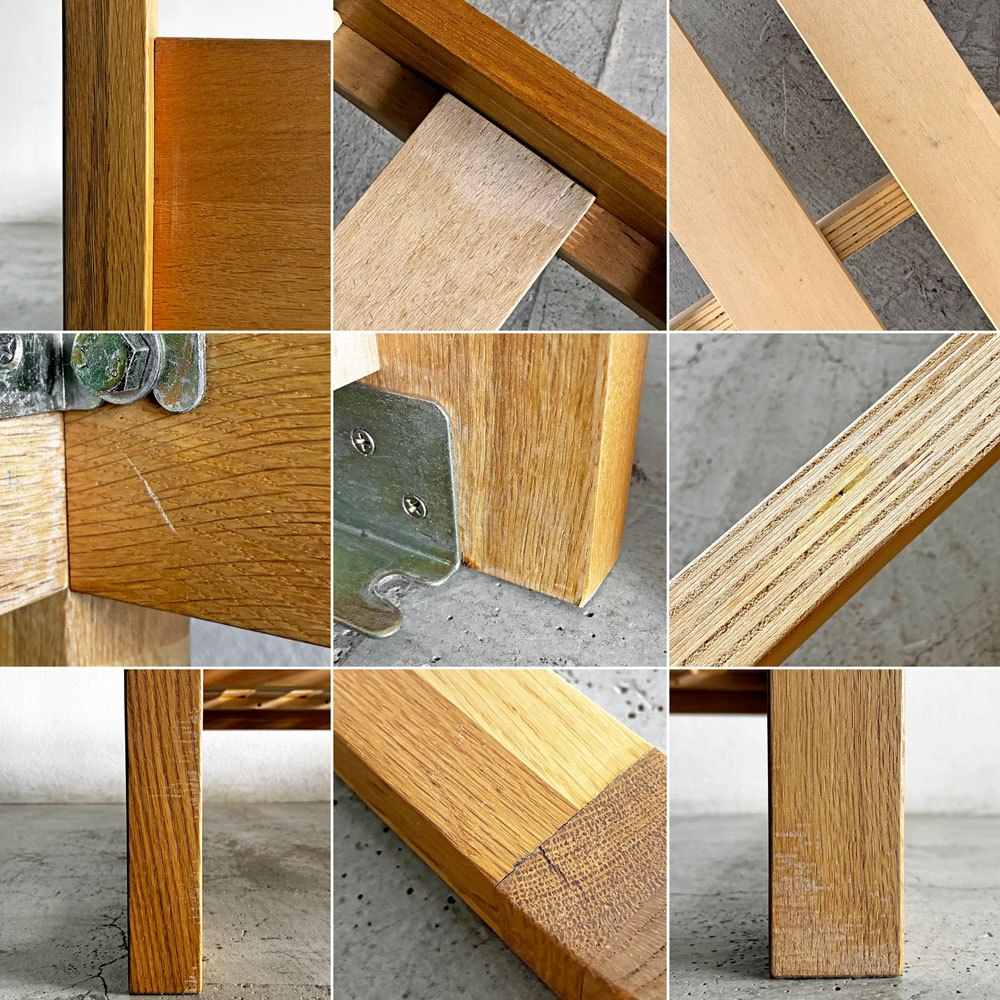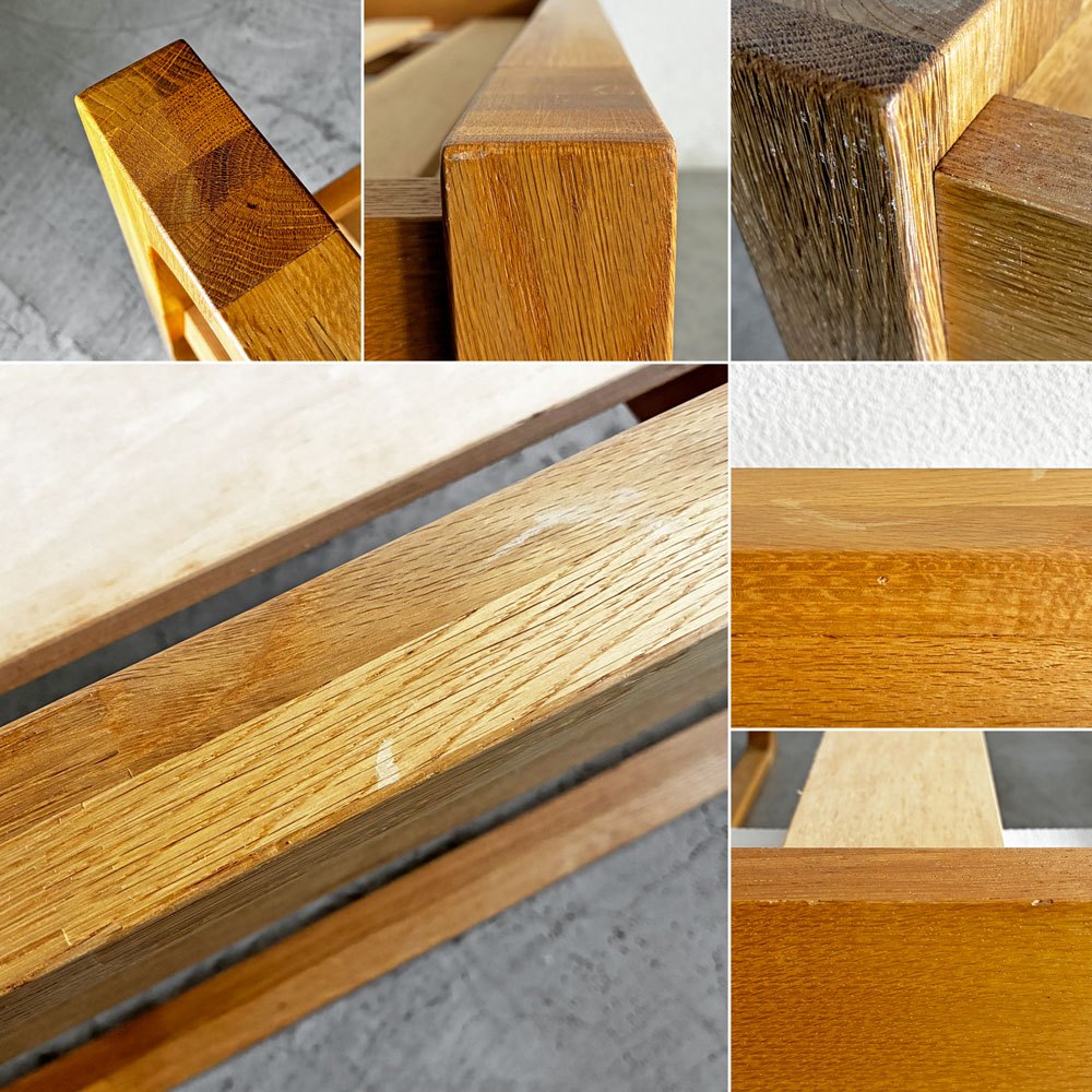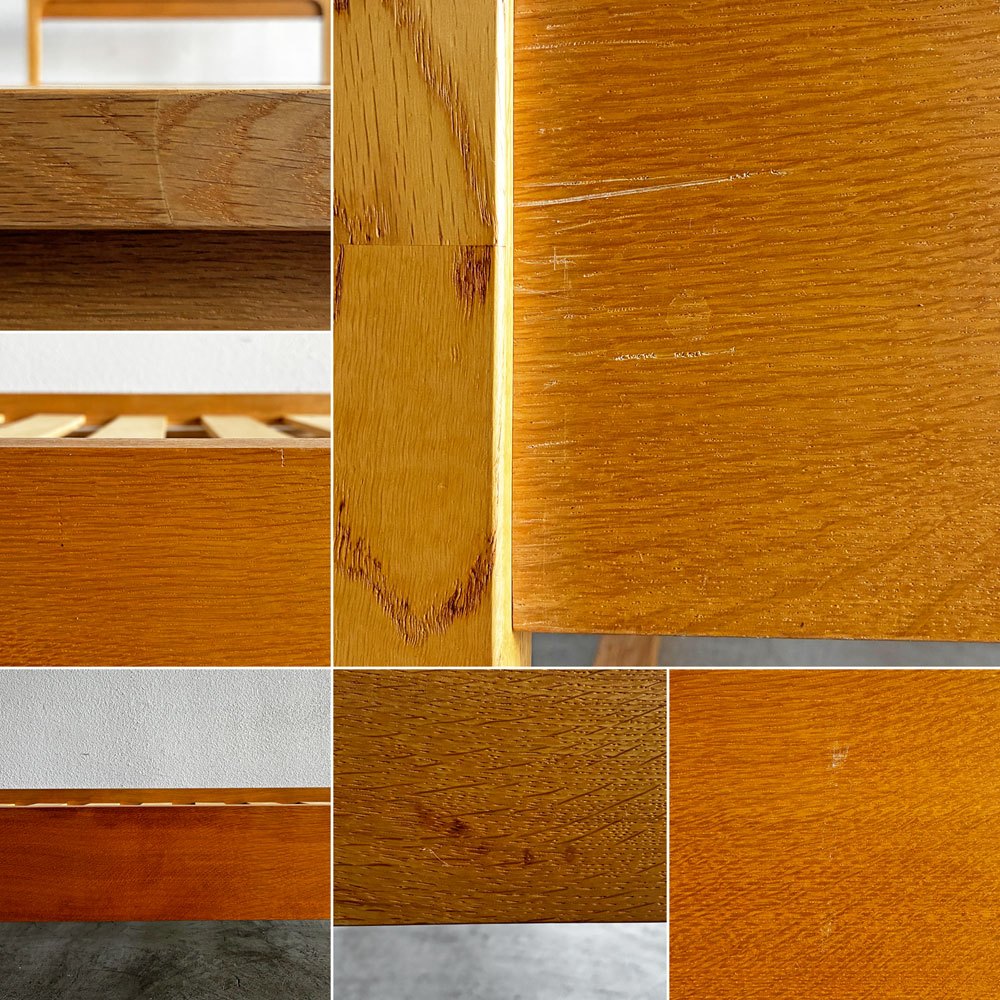 使用に伴いフレームには擦れや傷、打痕、削れ、わずかな亀裂、色落ちや色ムラ等が散見されます。また、すのこには木肌の毛羽立ち、若干のささくれや反り、黒ずみなどの取り切れない汚れが見受けられます。その他、金属パーツのくすみなどはあるものの、ご使用に支障となるがたつきやぐらつきといった不具合はございません。今後も安心して実用いただけるコンディションを保っております。