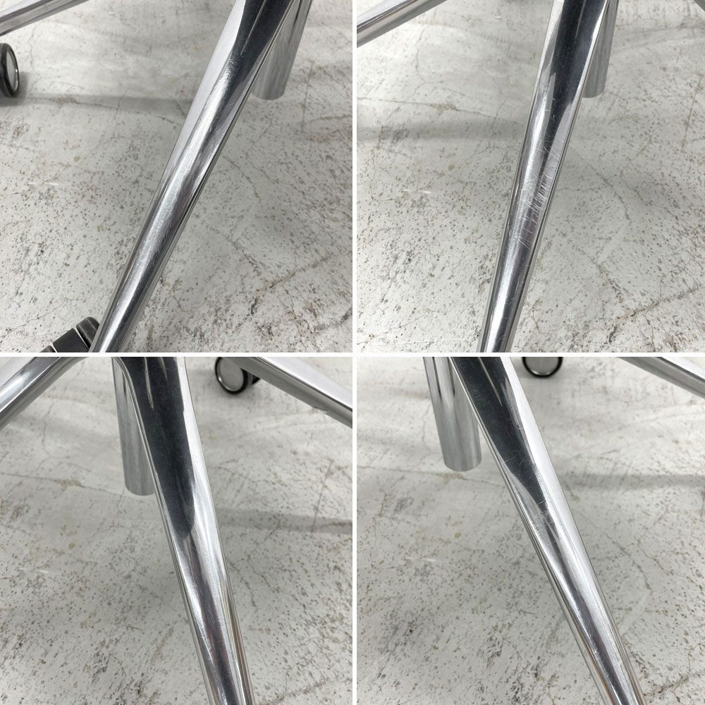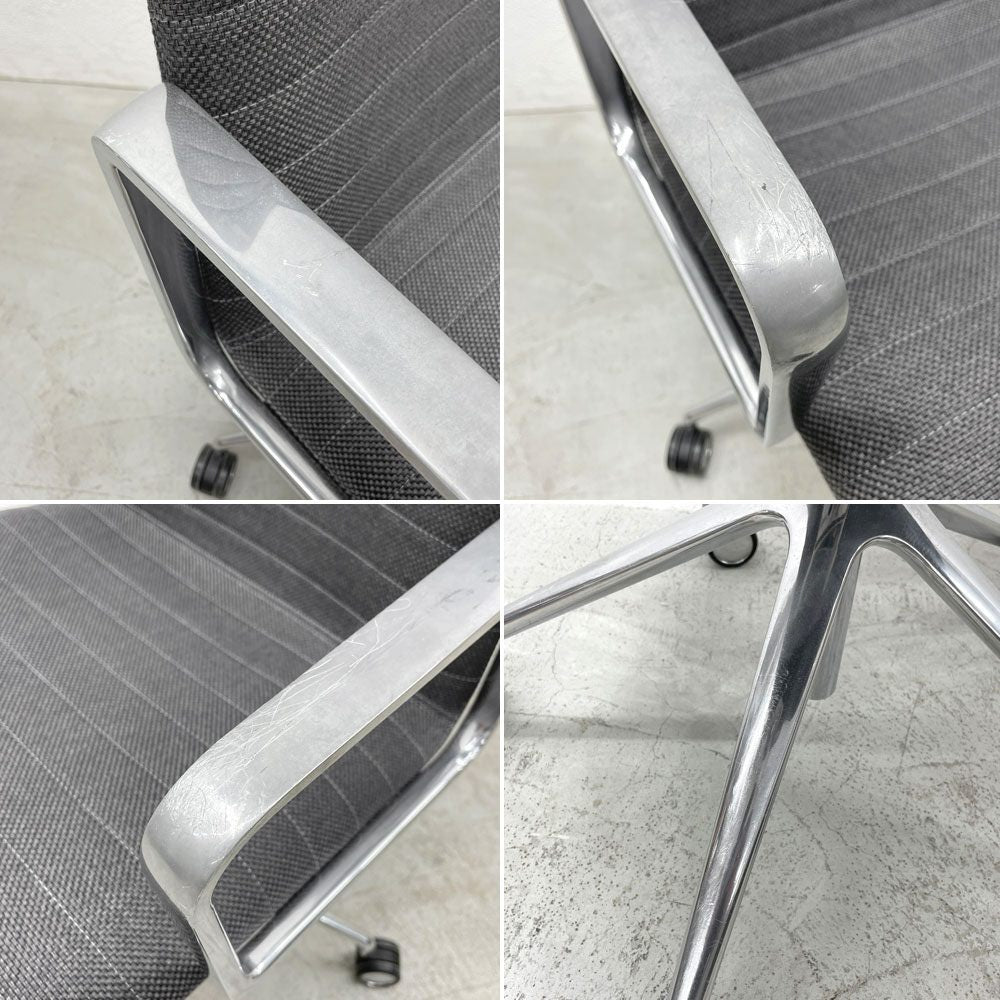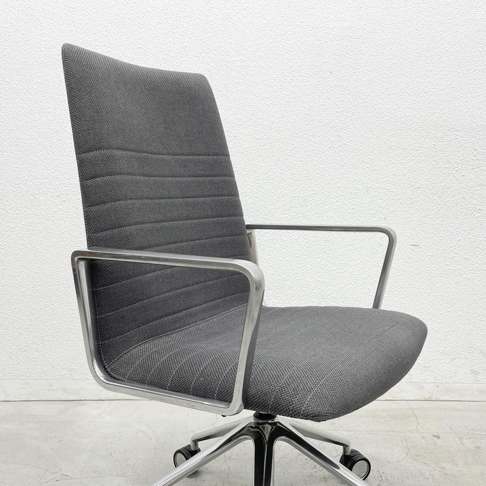 幅広い仕様を選択可能なアイテムとなっており、今回入荷したのは背もたれが3つある内の中間の高さであるインターミディエイトバックのアームチェア。張地はファブリックでアルミベースのキャスター仕様となっています。