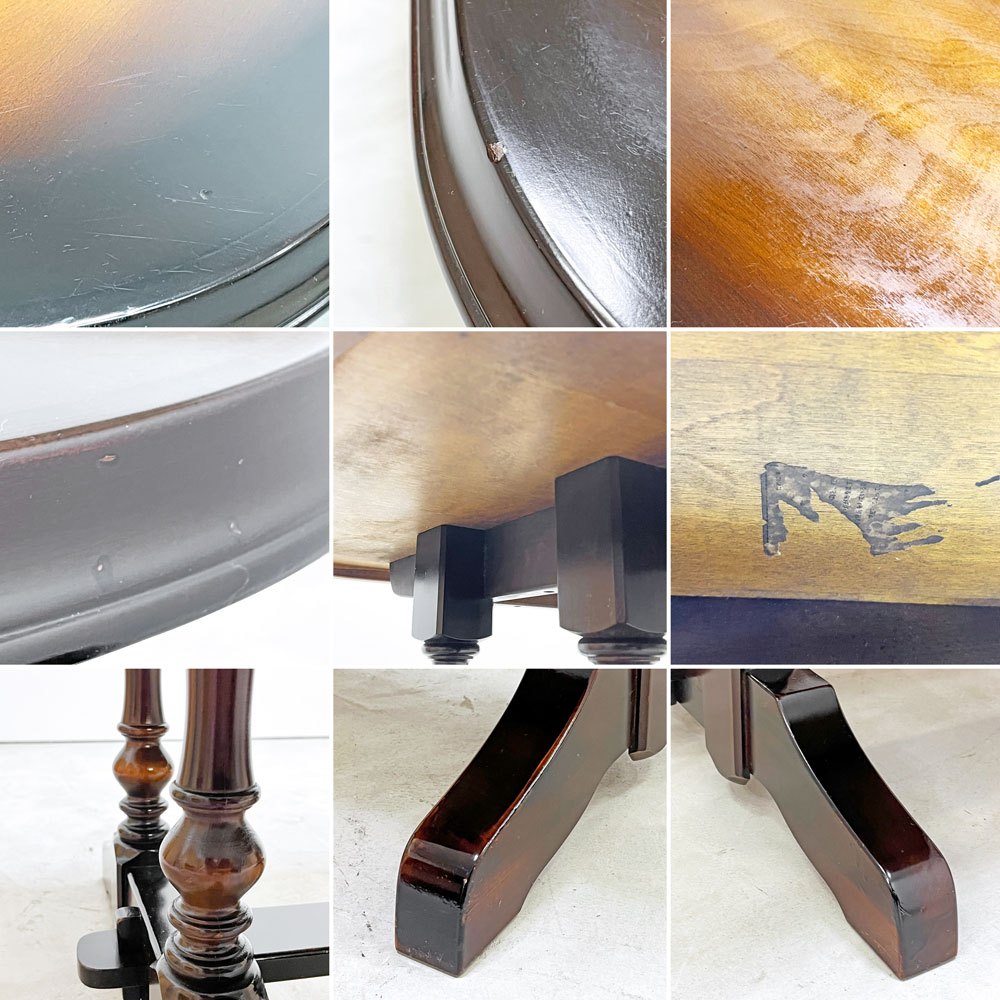 使用に伴い、傷やスレ、天板の色褪せや、表面塗装の剥がれ、打痕に伴うペイントロスやレタッチ痕、金具のくすみつき、取り切れない汚れ等が全体的に見られます。どれも美観を大きく損ねるものではなく、目立ったガタツキやグラつきもございません。これからも安心して実用していただけるコンディションを保っております。