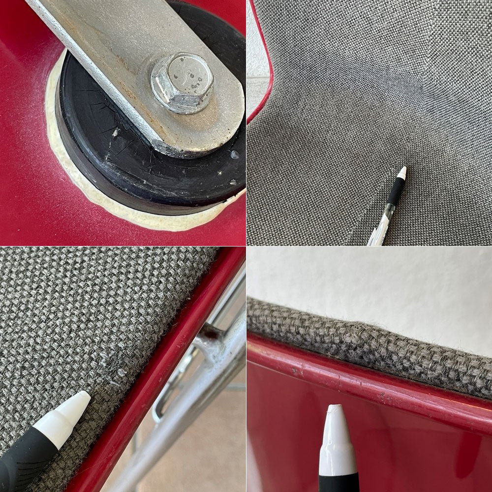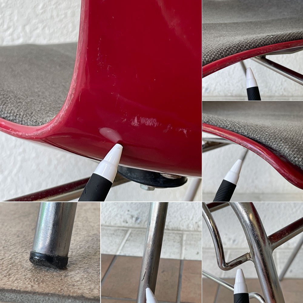 こちらはビンテージ品となります。 細かな擦れ傷や打痕、スクラッチなどがシェル全体に見られ、座面には毛羽立ちや黄変、ホツレによる穴などがございます。また、脚部にはくすみやサビ、メッキの剥がれ、グライズの削れ等が見られます。 シェルと脚部を繋ぐゴムマウントには経年による硬化・ひび割れがございますが、現状着座に問題はございません。また、脚部には歪みがあるものの、ガタツキ等は無く今後も安心してご使用頂けるコンディションを保っております。