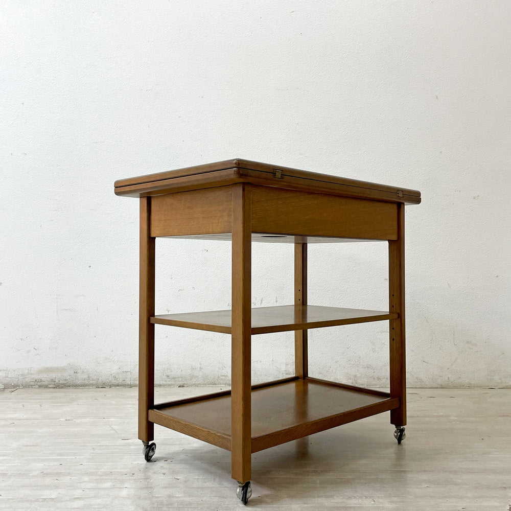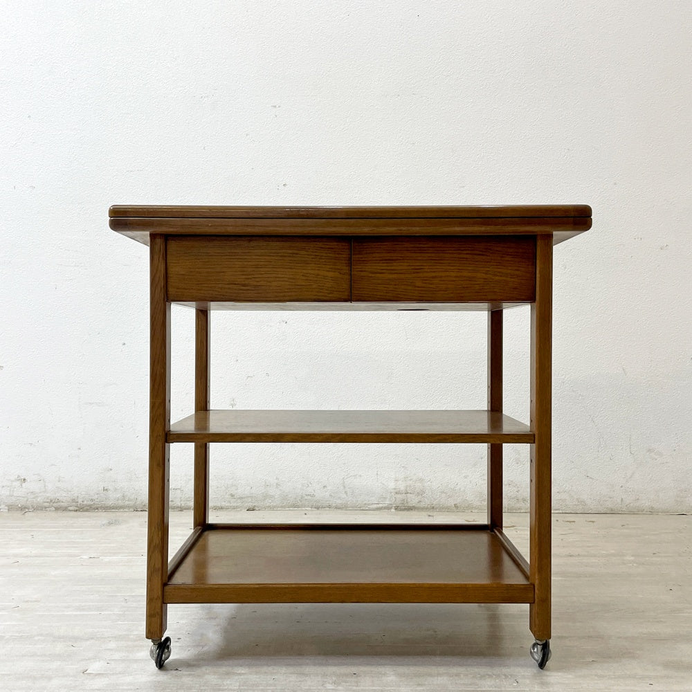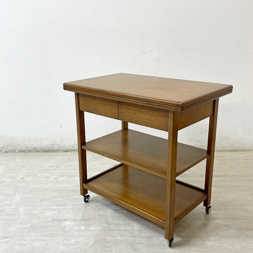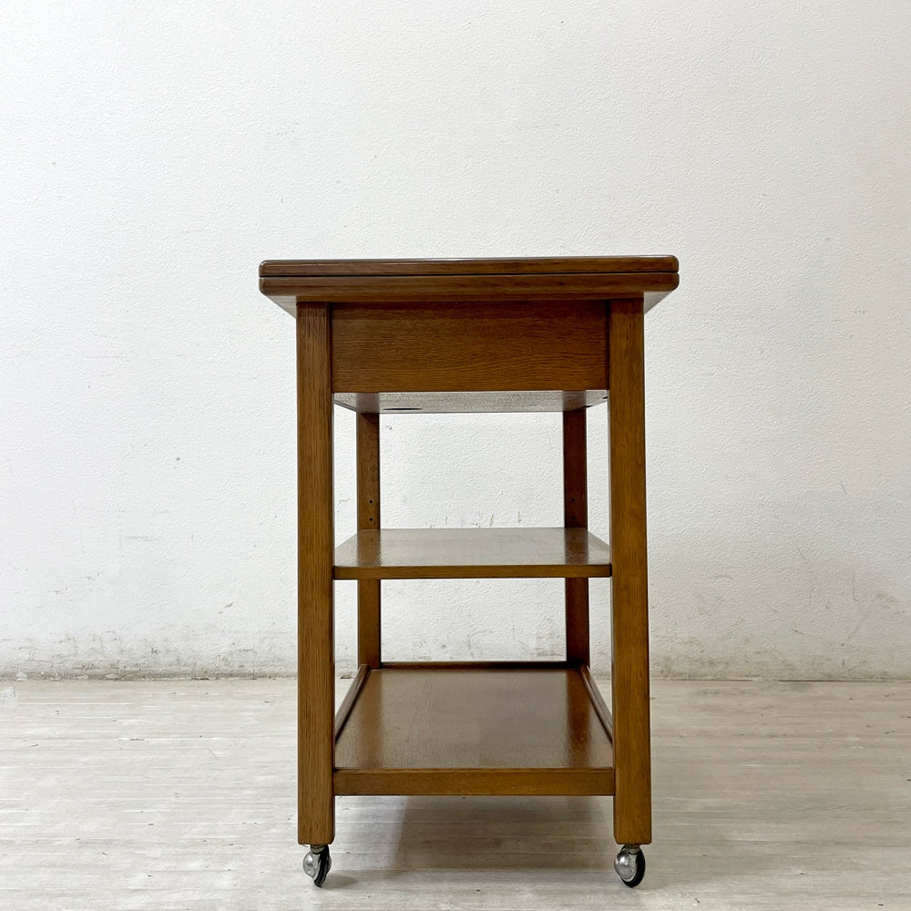 落ち着いた色合いのオーク材フレームを使用した木製ワゴン。天板を開き90度スライドさせる事で伸長が出来ますので、シーンや用途に合わせた使い分けが出来ます。