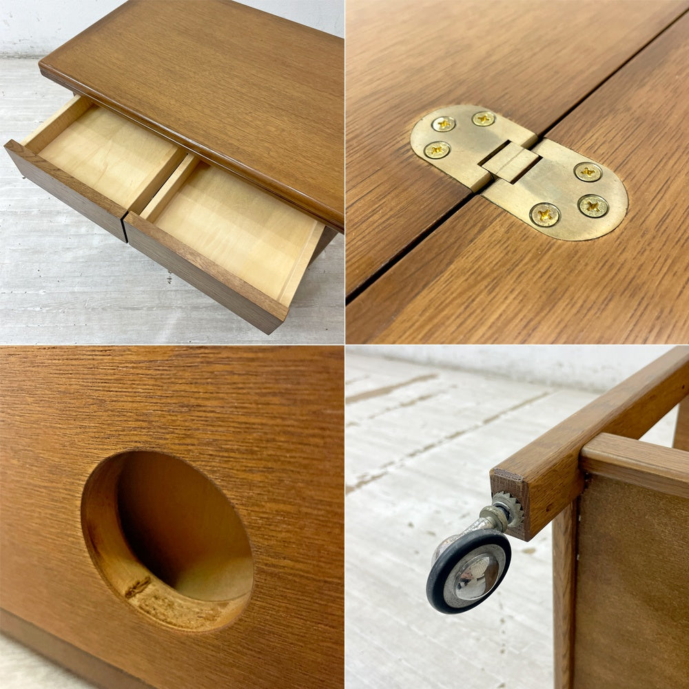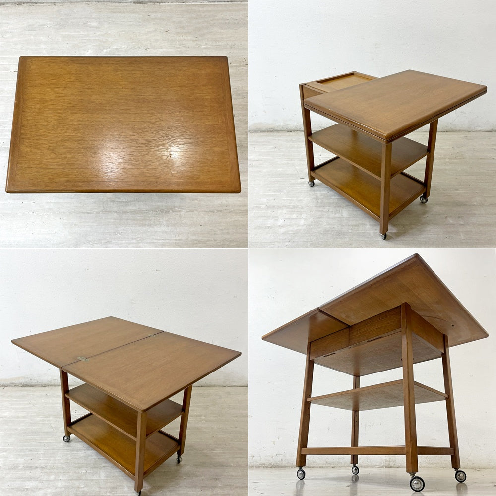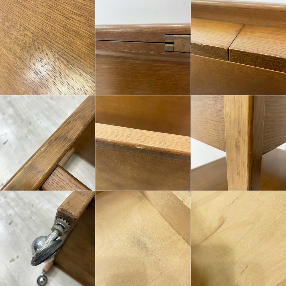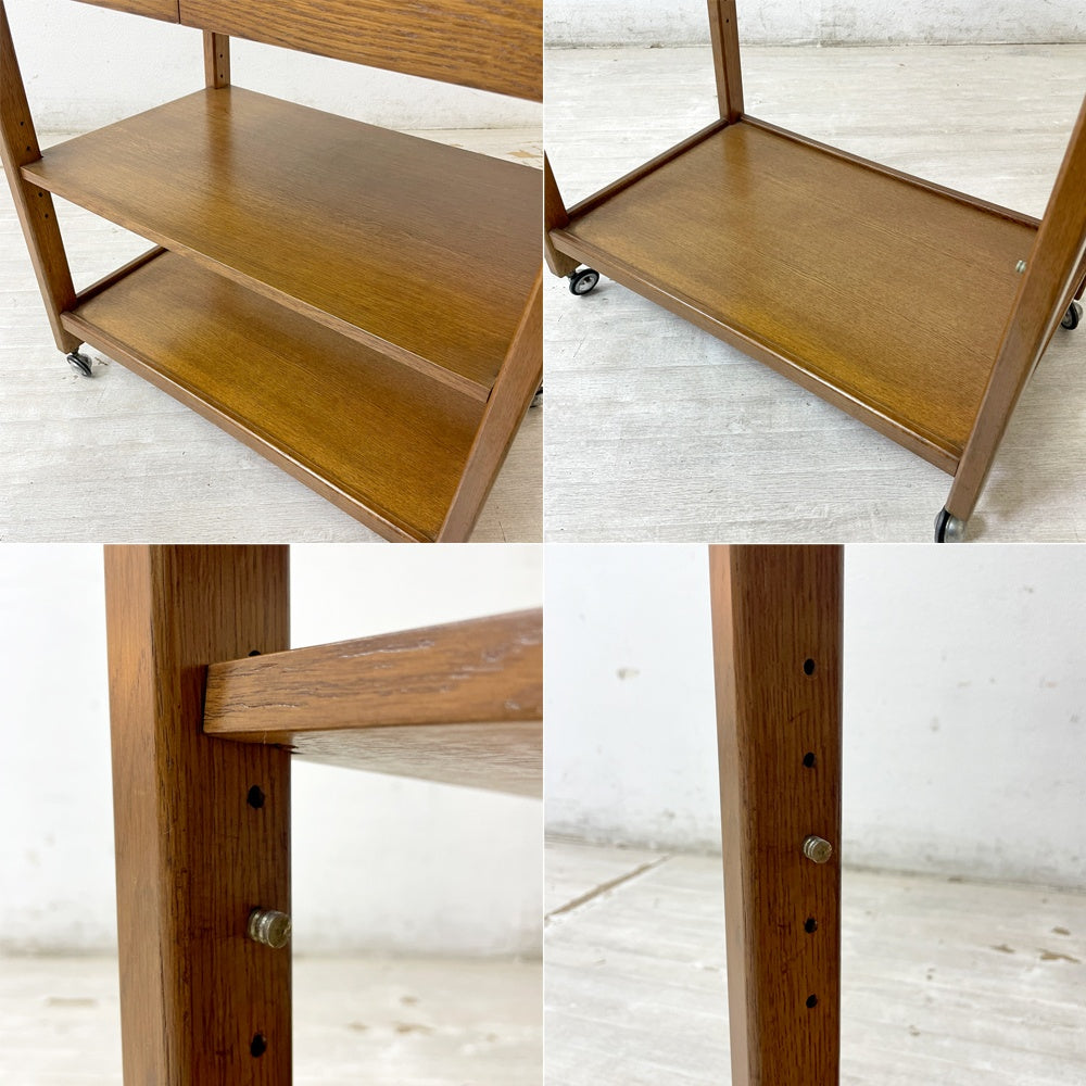 落ち着いた色合いのオーク材フレームを使用した木製ワゴン。天板を開き90度スライドさせる事で伸長が出来ますので、シーンや用途に合わせた使い分けが出来ます。
