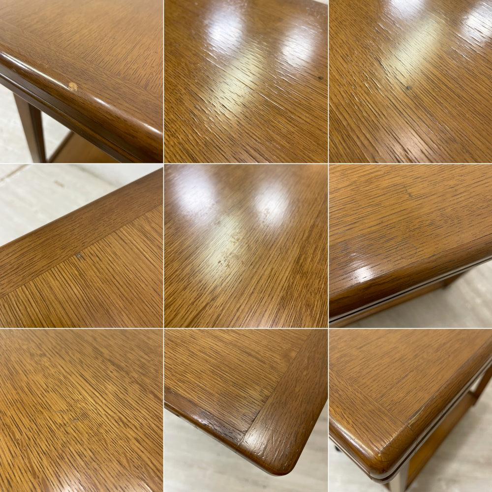 使用に伴い、傷や擦れ、打痕やペイントロス、天板突板の表面のざらつき、キャスターのくすみがございます。また、抽斗内部には赤いインク汚れや黒ずみ、ペン跡がございます。やや使用感がございますが、ガタツキやグラつき等の使用に問題となるダメージは無く、今後も十分に実用頂けるコンディションを保っております。
