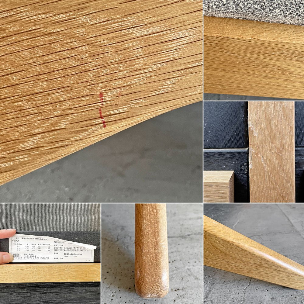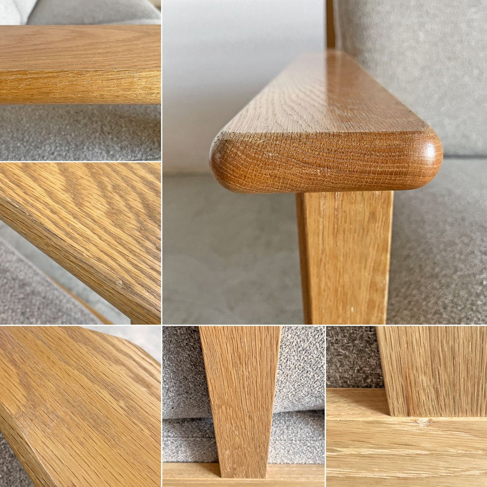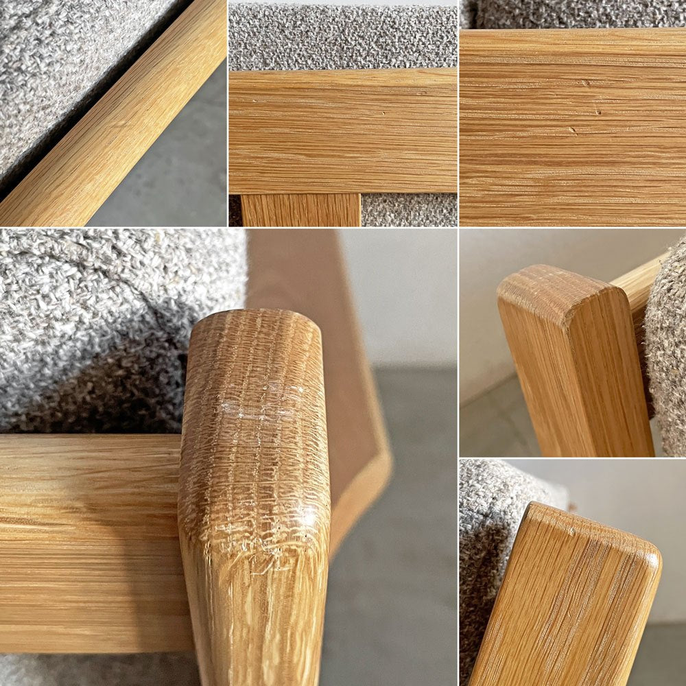 フレームには擦れや傷、打痕、ペン痕などの取り切れない汚れ等が見受けられるとともに、シート裏面の一部に表面の割れが確認できます。また、ファブリックには毛玉や毛羽立ちが確認できるほか、座面クッションカバーの裏面にマジックテープが付いていたと思われる痕が残っています。なお、カバーファスナーのスライダーが1点代替品に交換されており、その補修痕と思われる縫い目のほつれがございます。ファブリック自体の色味も相まって目立った汚れは感じられず、がたつきやぐらつきといったご使用に問題となるダメージはございません。これからも安心して実用いただけるコンディションを保っております。
