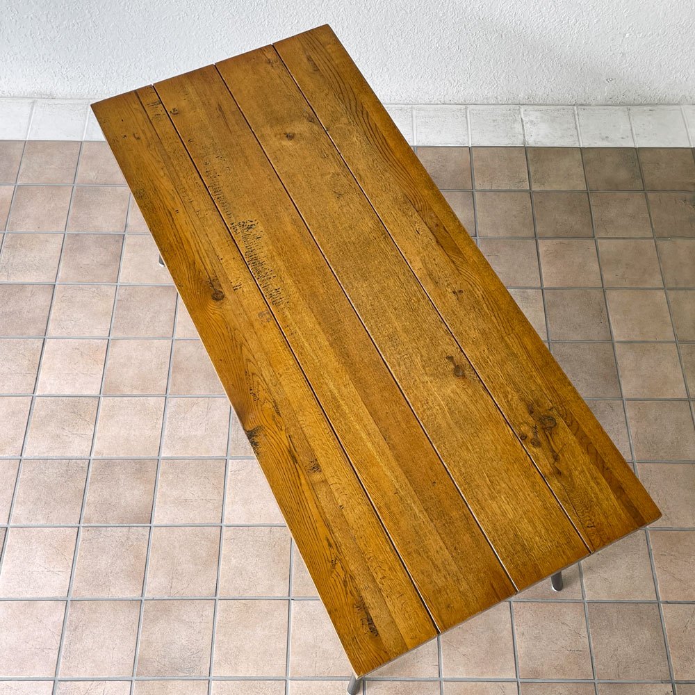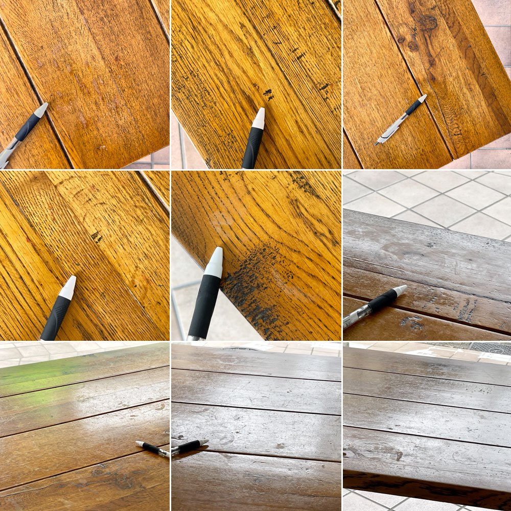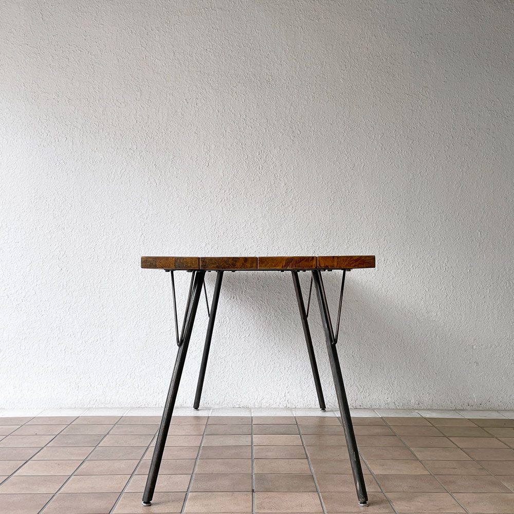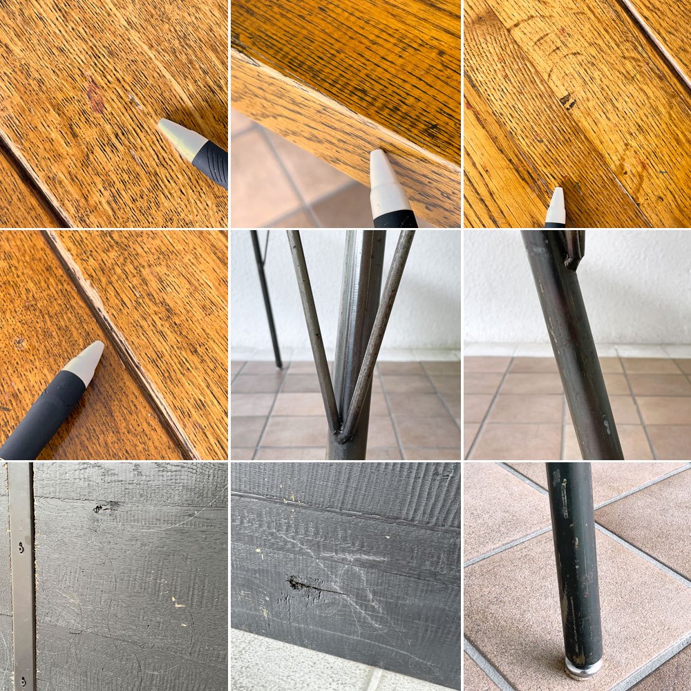 使用に伴う擦れ傷のほか、線傷や打痕、着色、ペイントロスやレタッチ痕、木部表面のヒビや微細な反り、フレームのくすみ等全体的に使用感がみられるものの、いずれも大きく風合いを損なうものではございません。ほか天板の塗装には劣化によりわずかなべたつきがあり、輪染み等がつきやすい状態となっております。グラつき等は無く、通常のご使用に大きく影響するものではございませんが、コンディションを鑑みお求めやすい価格での販売となります。予めご承知の上ご検討下さいますようお願い申し上げます。
