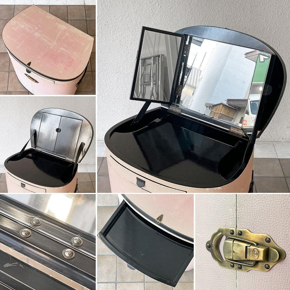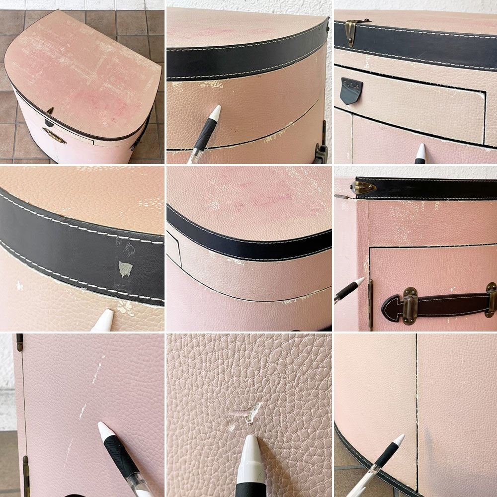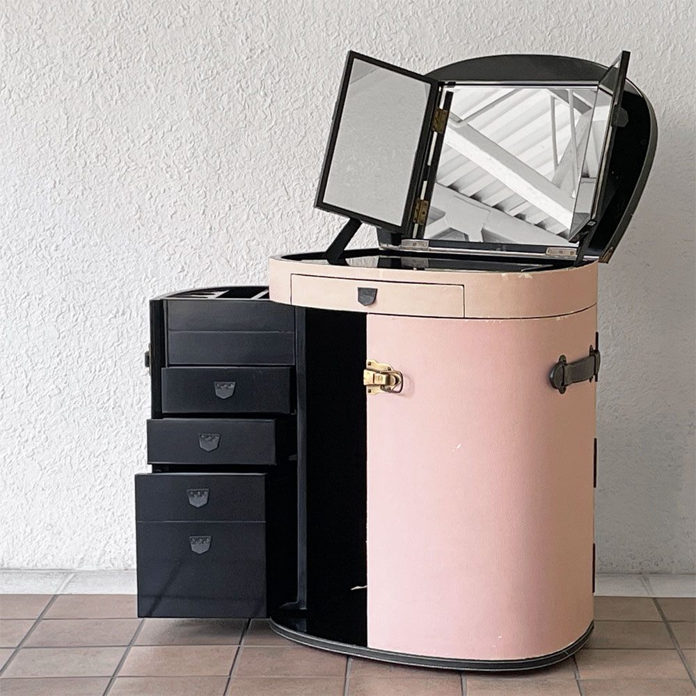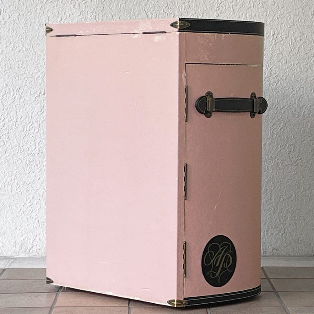 国内では未発売の貴重な一点。可愛らしいピンクに収納部のブラックが高級感を与え、年月で生まれた味わいはビンテージトランクのような風合い。独特の存在感を放っています。