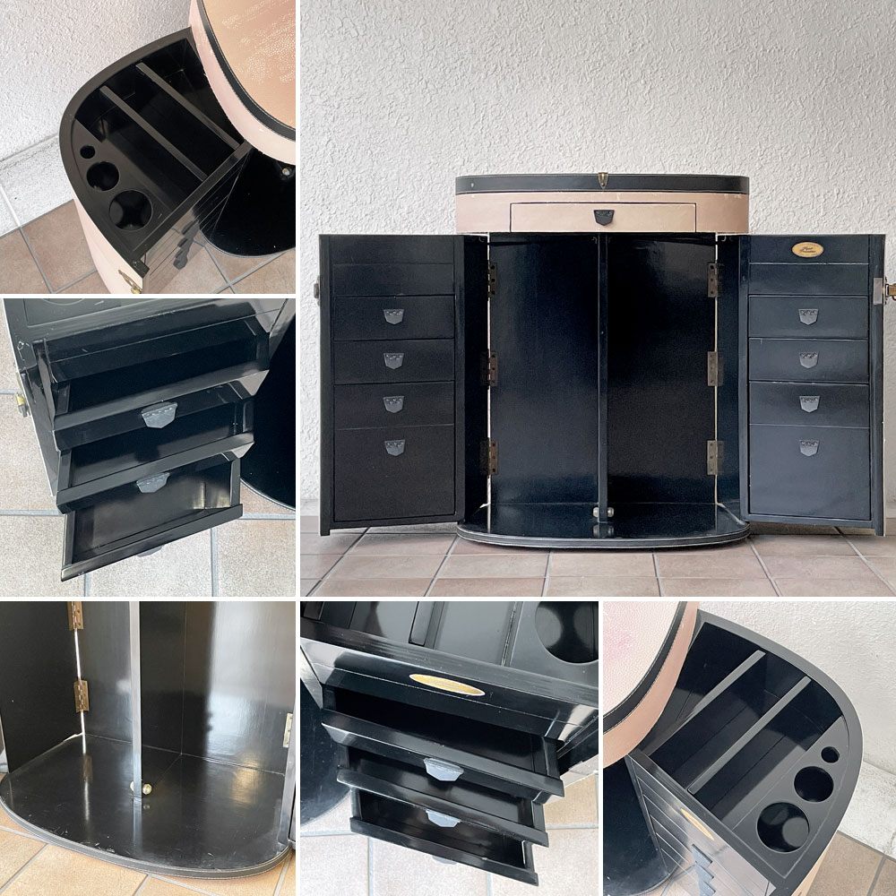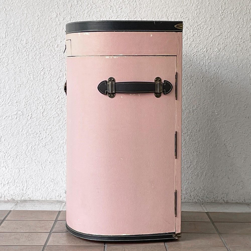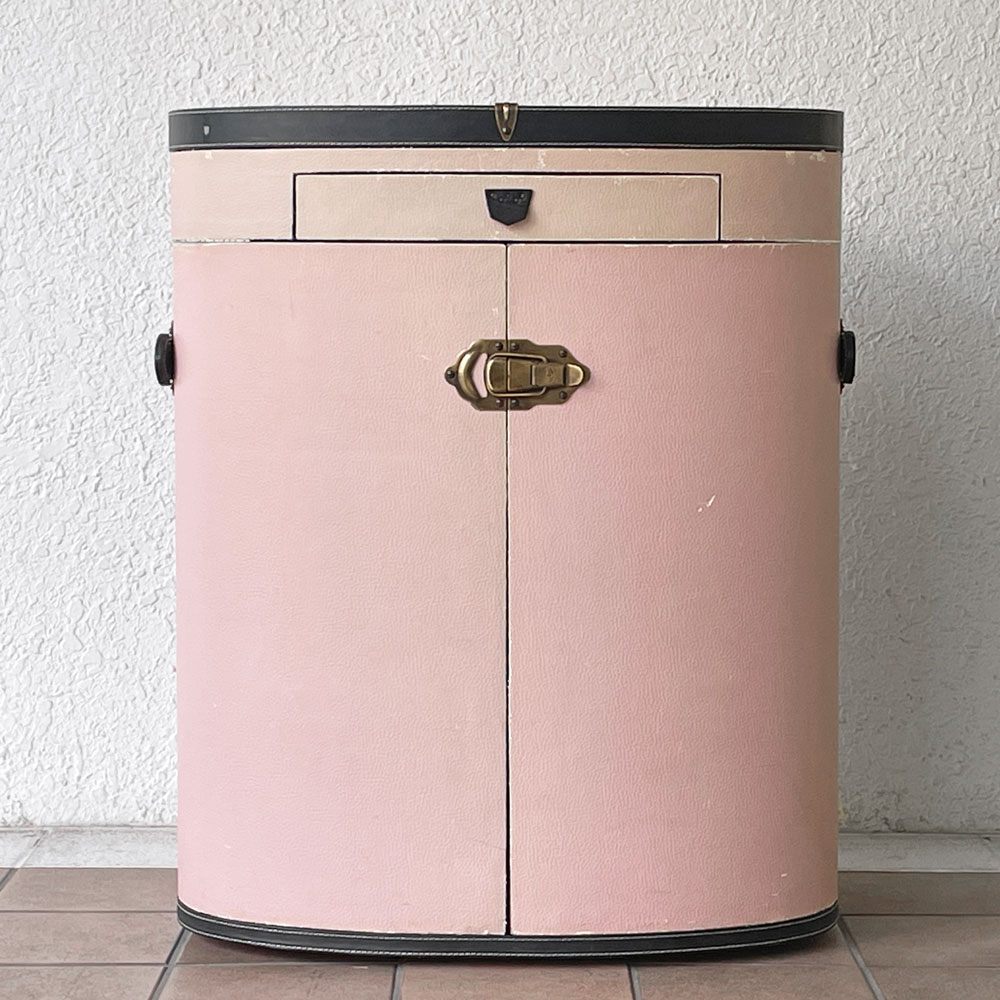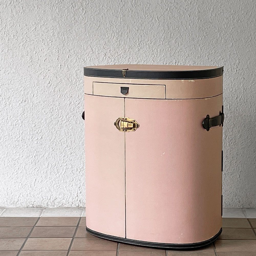 国内では未発売の貴重な一点。可愛らしいピンクに収納部のブラックが高級感を与え、年月で生まれた味わいはビンテージトランクのような風合い。独特の存在感を放っています。