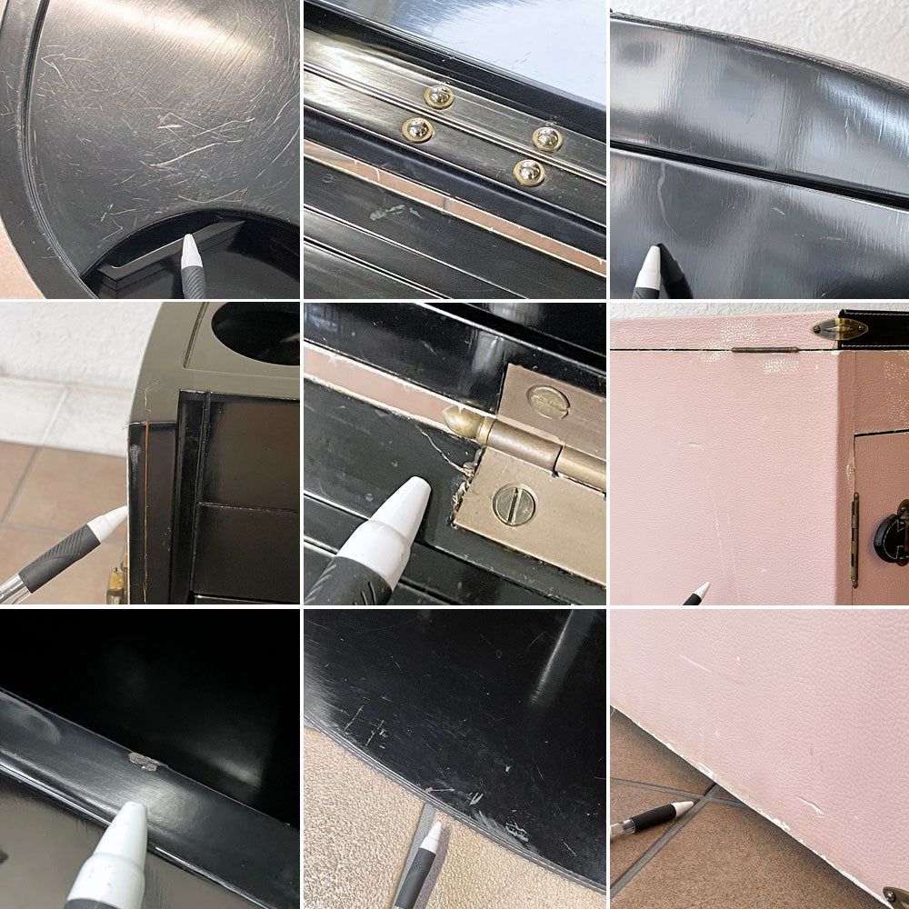 使用に伴う擦れ傷の他、スクラッチや線傷、天面を中心とした表面の剥がれや着色、天面直下の抽斗付近を中心とした色褪せ、収納部など縁面の細かな解れはがれ、ペイントロスやレタッチ痕、フレーム表面のヒビ等やや使用感は見られるものの、いずれも風合いを著しく損なうものではございません。ご使用に問題となるダメージは無く、両側面のレザーベルトは交換を実施しており良好な状態です。引き続き雰囲気を楽しみながらお使い頂けるコンディションを保っております。