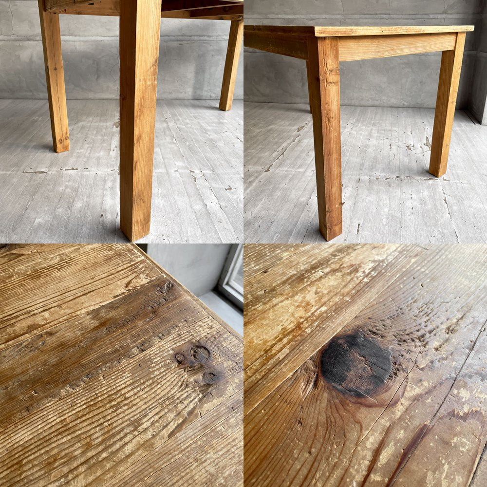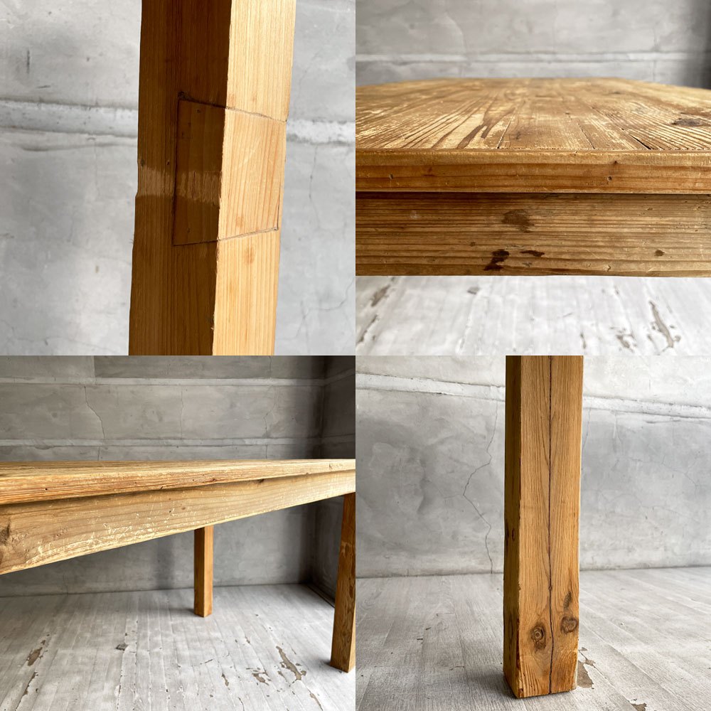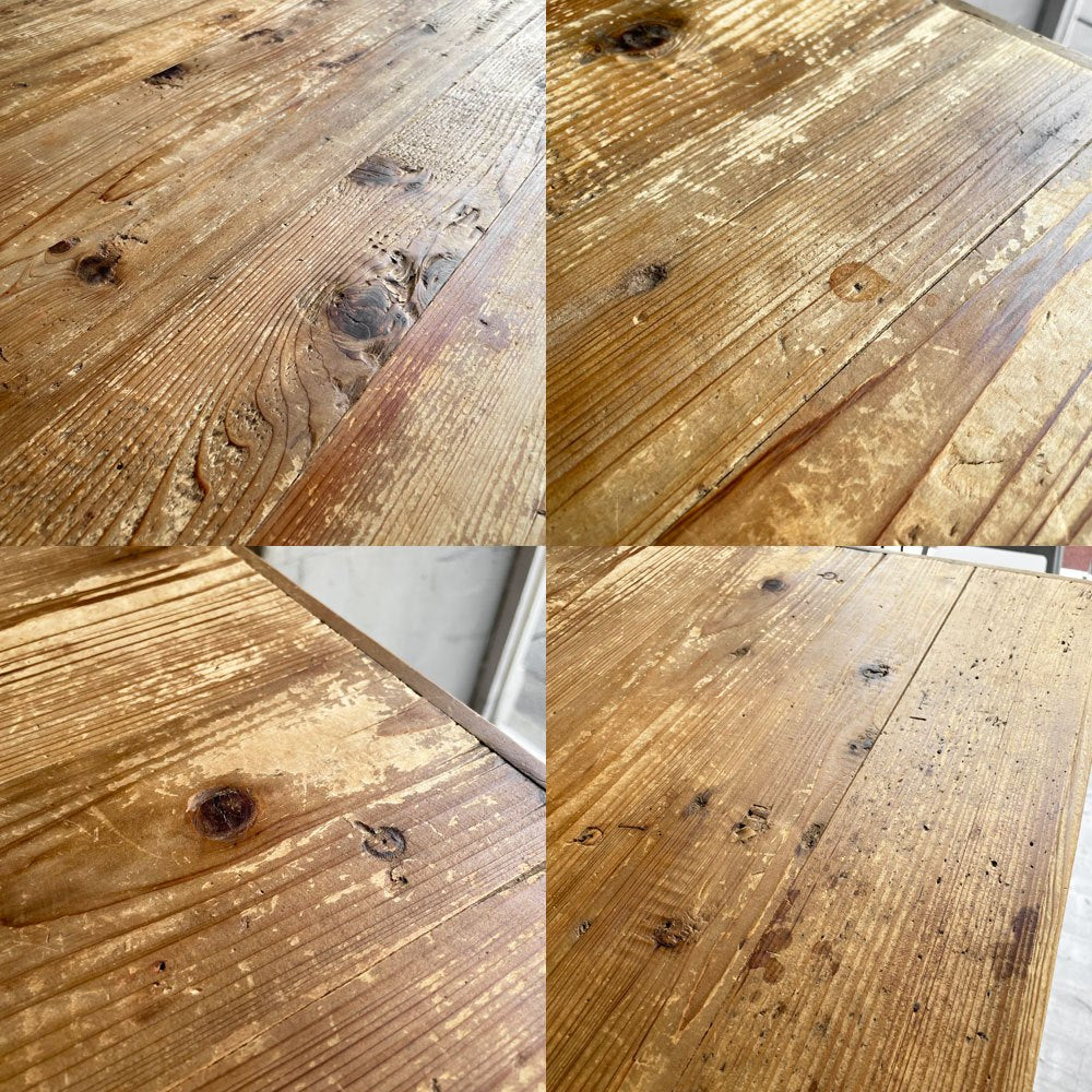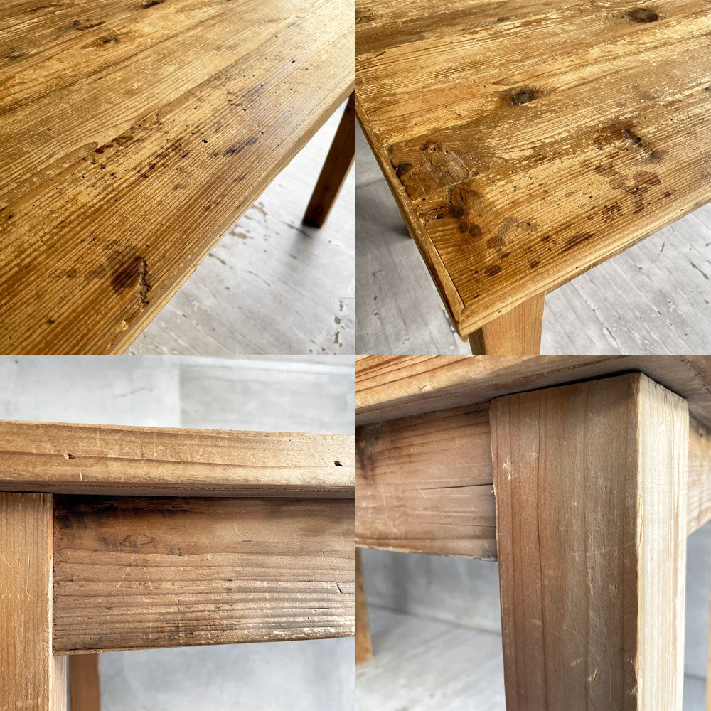 こちらは古材を使用したお品物となります。傷や擦れ、打痕や色ムラ、染みや汚れ、ペイントロスやヒビ、凹凸や細かな穴などがございますが製造時からの仕様となり、古材特有の風合いとしてお楽しみ頂けるかと思います。その他、使用に伴う傷や擦れ、染みや汚れなどが見受け有れます。また、本来は幕板と脚部との間に細身の金属バーが付属している品物ですが金属バーは欠品しております。金属バーの欠品しておりますが、強度なども問題無く、ガタつきやグラつきなどもございませんので、通常通りお使い頂けます。上記のコンディションを考慮致しまして、通常よりもお求めやすい価格にて出品致します。
