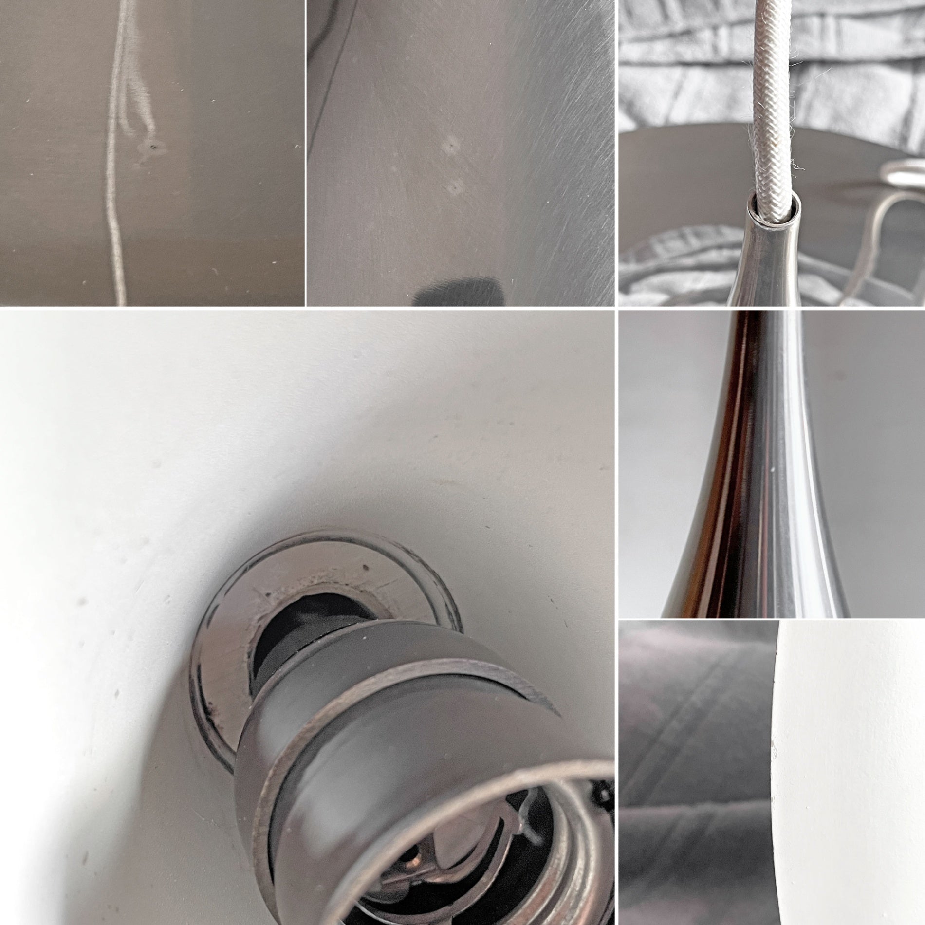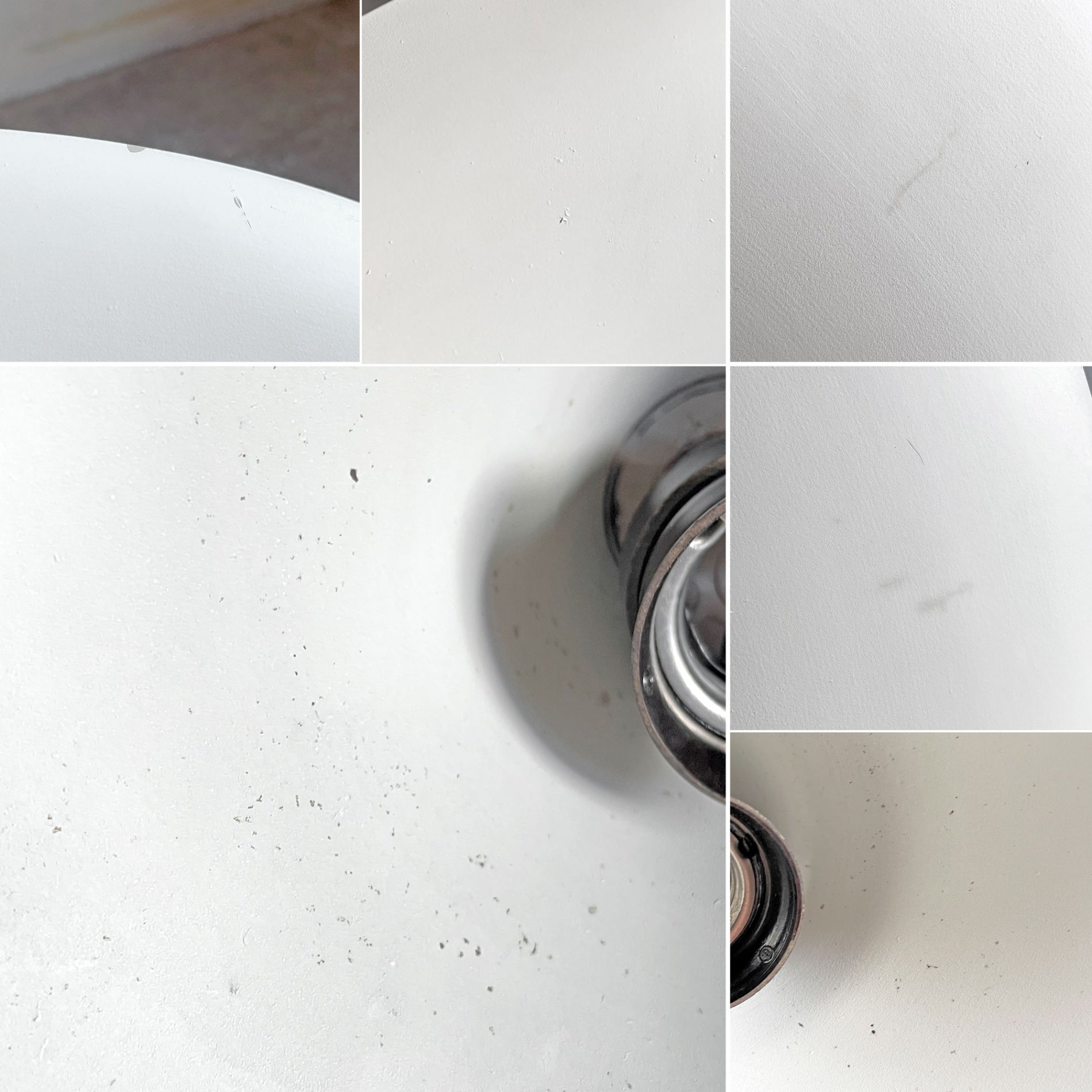 また、シェードの縁と内部を中心に、塗装の剥がれや凹凸、うっすらとした黄ばみ、ソケット周りの取りきれない汚れが多数見られる他、コードに僅かな染みございますが、いずれも風合いを大きく損なうものではございません。