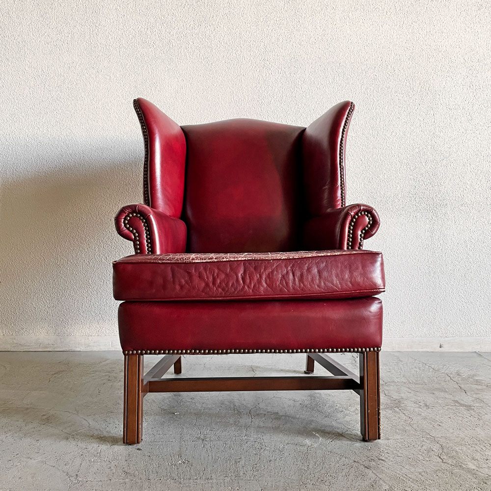 深みのあるワインレッドカラーに、随所へ施された鋲打ち装飾がアクセントとなり、クラシカルな印象を与えています。背もたれの両端が張り出したウィングバック仕様で、包み込まれるような座り心地を感じさせるクラシカルなフォルムが特徴です。