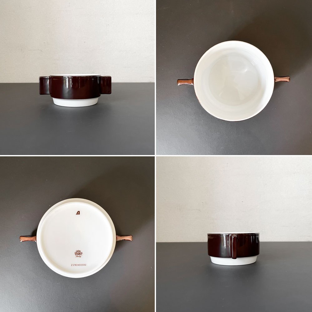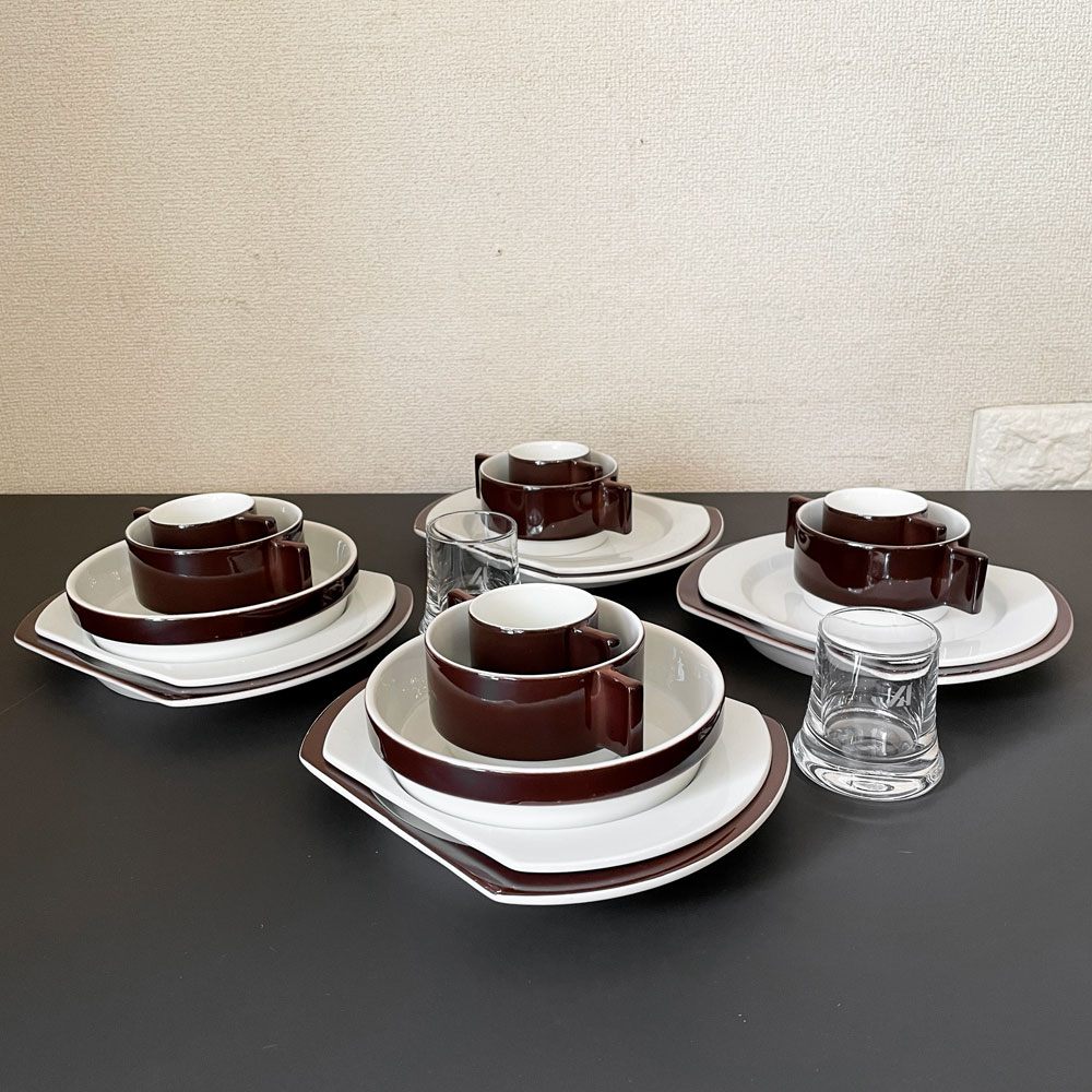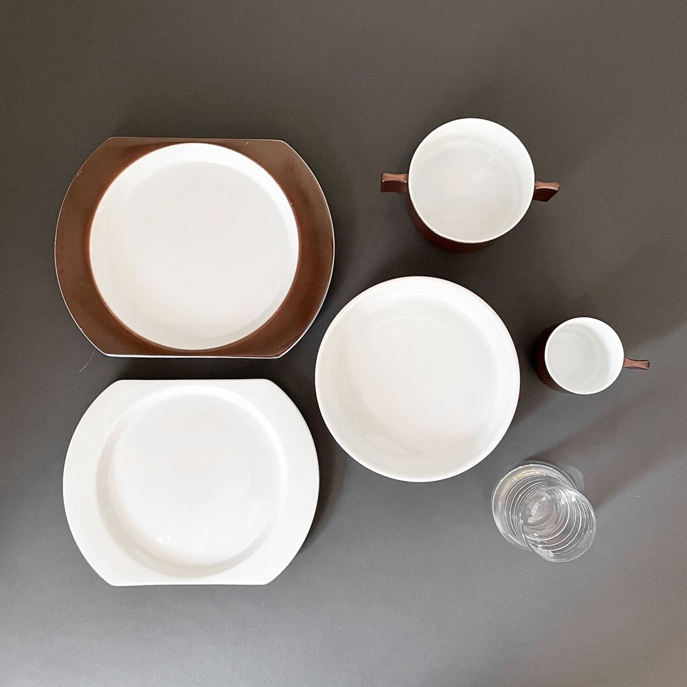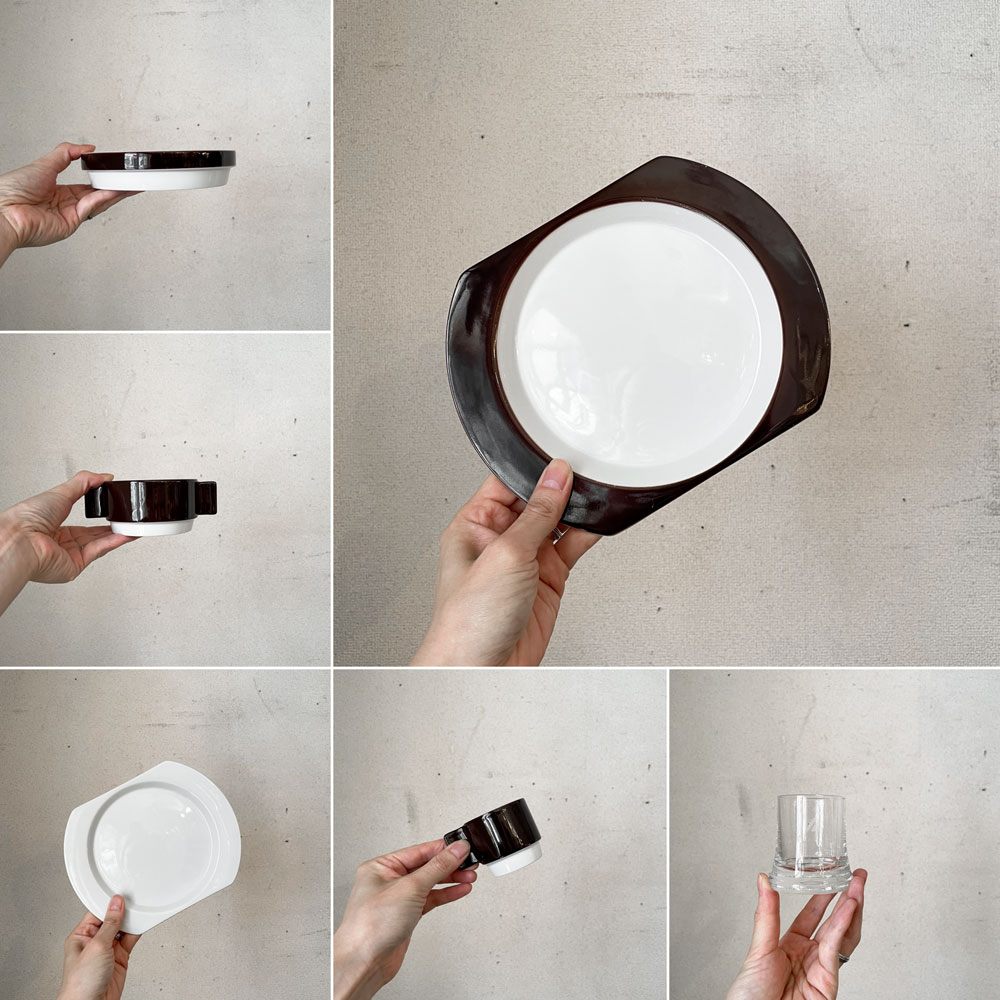 ホワイトとブラウンのツートンカラーのシンプルな形状ながら、そのフォルムからミッドセンチュリー感を存分に感じられるプレート大小&ボウル&スープカップ&デミタスカップ&グラスの6点セット。