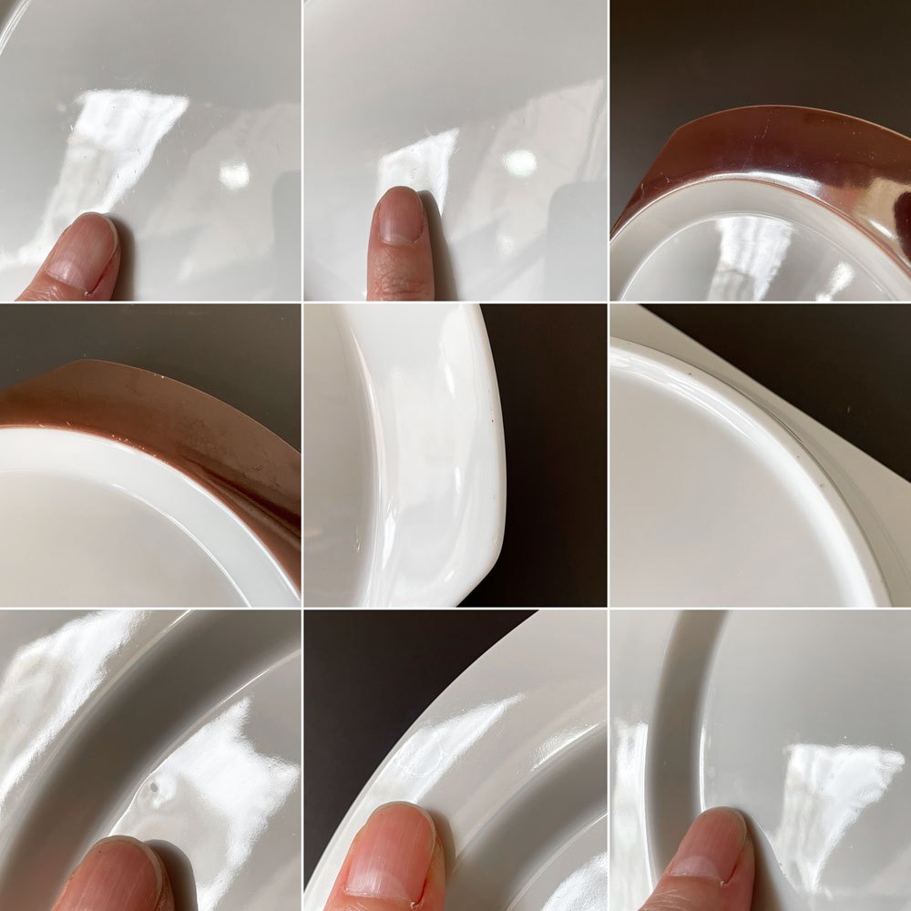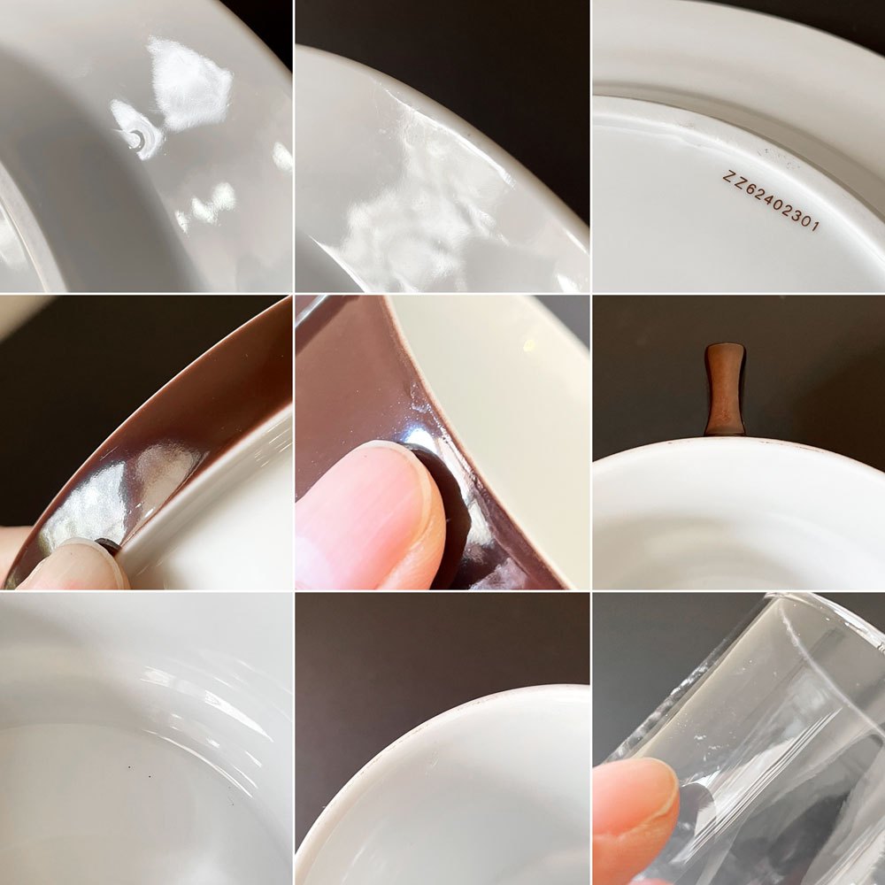 こちらはビンテージのお品物です。全体に擦れや傷、小さな欠け、削れによるペイントロス、黒ずみや水痕、塗装の付着といった取り切れない汚れ等が見受けられます。また、黒点や釉薬のムラとそれに伴うざらつき、くぼみなどの製造痕がございますが、ご使用に支障となる割れなどはございません。機内食器として使われていたためそれなりのダメージはあるものの、まだまだ実用いただけるコンディションを保っております。