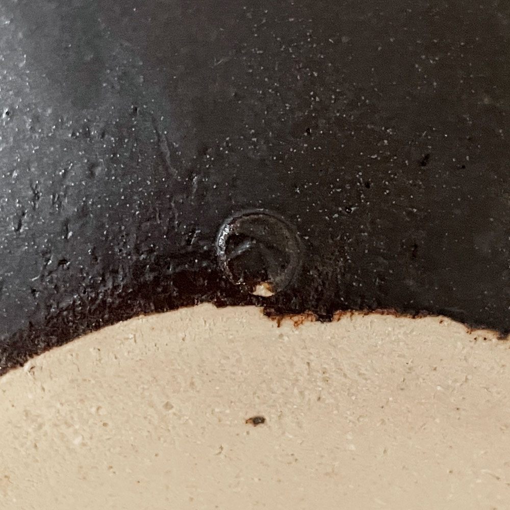 若干の擦れやスクラッチ傷が見受けられます。また、釉薬のざらつきや濃淡のムラ、黒点や焼け跡、小さな穴や底面の窯傷などの製造痕が全体に確認できますが、割れや欠けといった著しく目立ったダメージはございません。いずれも風合いとしてお楽しみいただきながらこれからも実用いただけます。なお、直火とオーブンでのご使用は可能ですがIH調理器には対応していません。