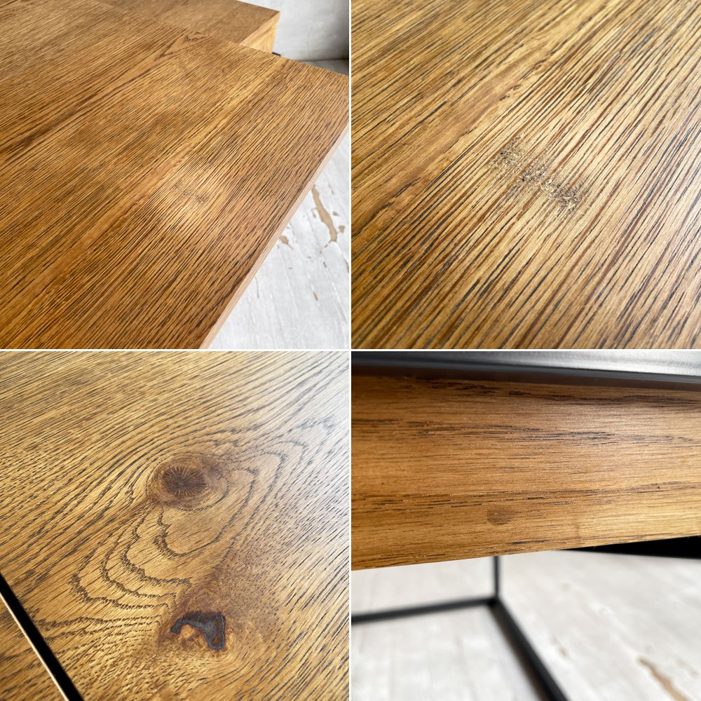 オーク材特有の力強い山形のハッキリとした木目を活かしたシンプルなデザインに、インダストリアルテイストが加えられた、温かみも感じられるしっかりとした造りの一品。