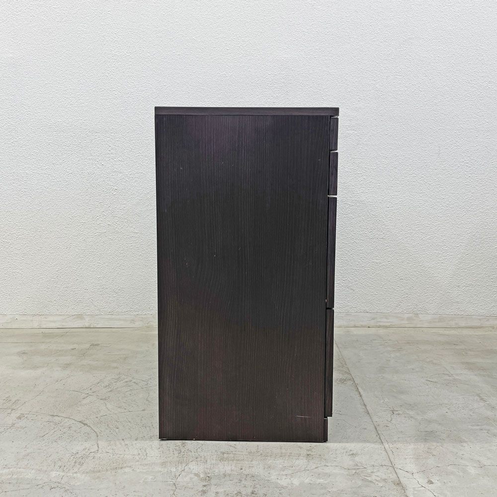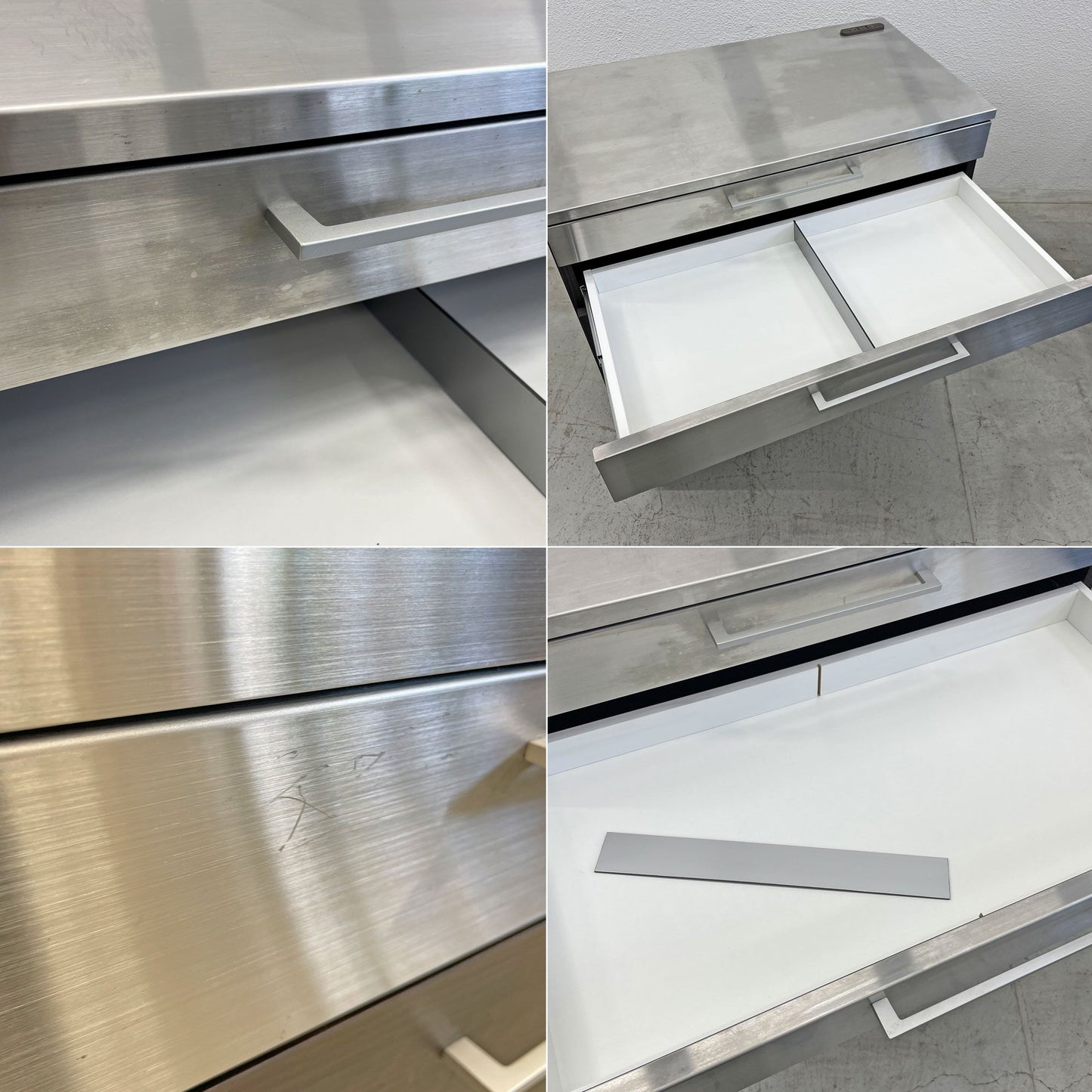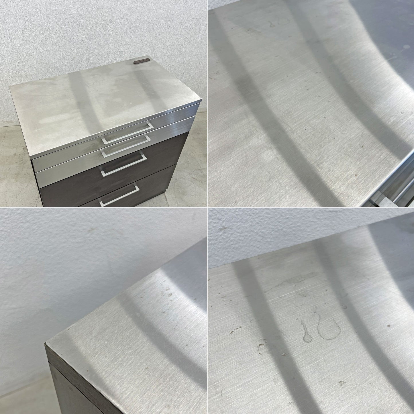 使用に伴い、ステンレス面に細かなスレやキズ、細かな取り切れない汚れ、木面には細かなスレ、最下段ドロワーに1か所の打痕、フレーム部の剥がれや縁のスレキズがございます。