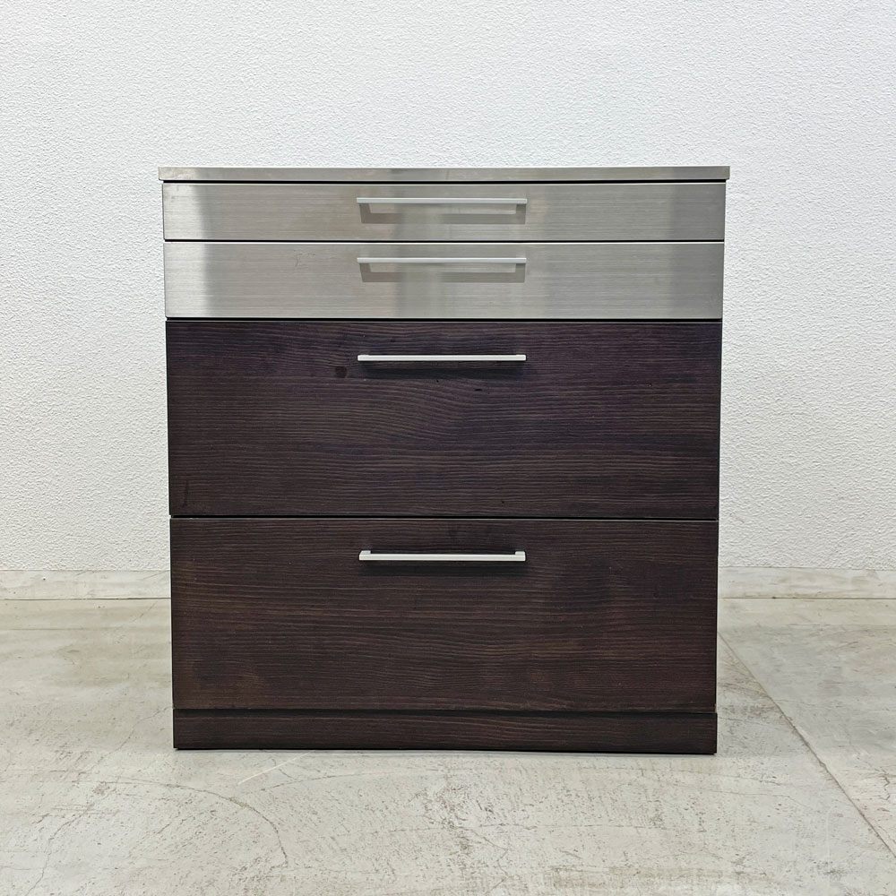 天板、上2段のドロワーがステンレスでデザインされている機能的な面と収納容量を持ちます。