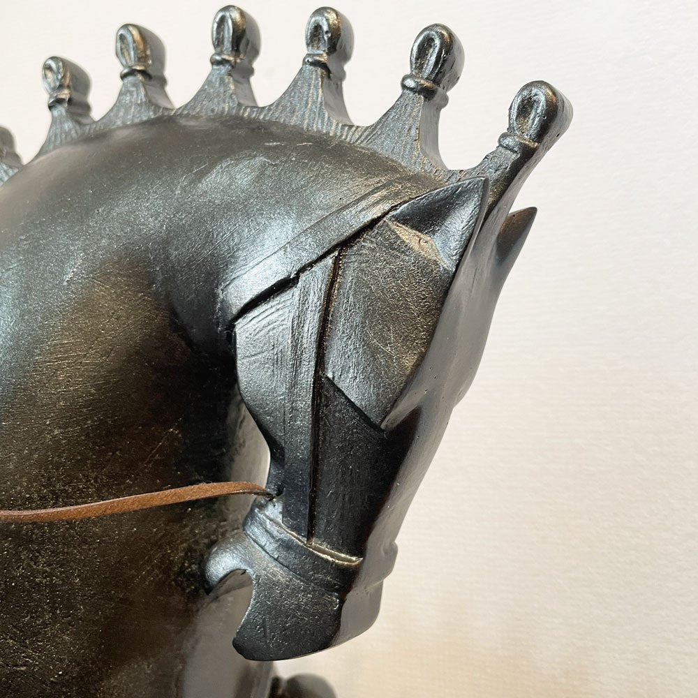 " ナイトブラック オブジェ 乗馬騎士 "は、本体と台座に樹脂と石灰などを混ぜ合わせた硬質な合成樹脂「ポリレジン(ポリエステル樹脂)」、デコレーションにラッカー塗装のスチールを使用しています。台座をセメント調に仕上げる等、表面の艶感や質感に変化を加え、モノトーンカラーで仕上げられたシックで大人びた雰囲気を醸し出しています。
