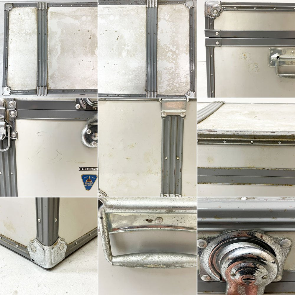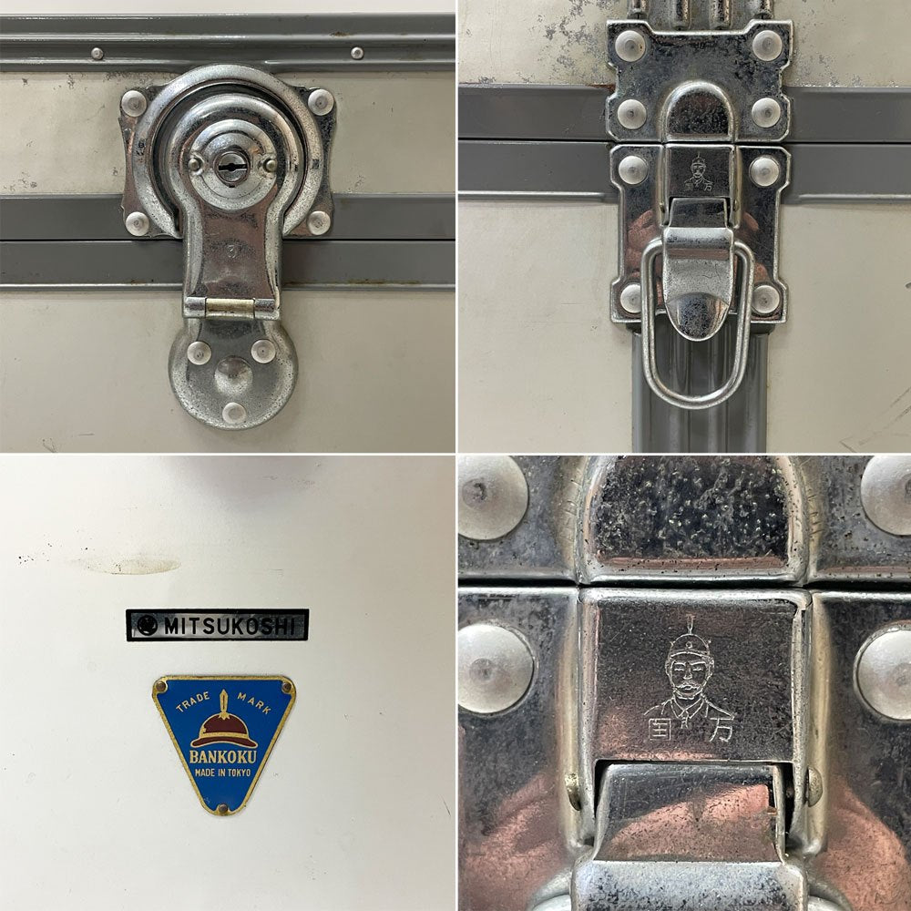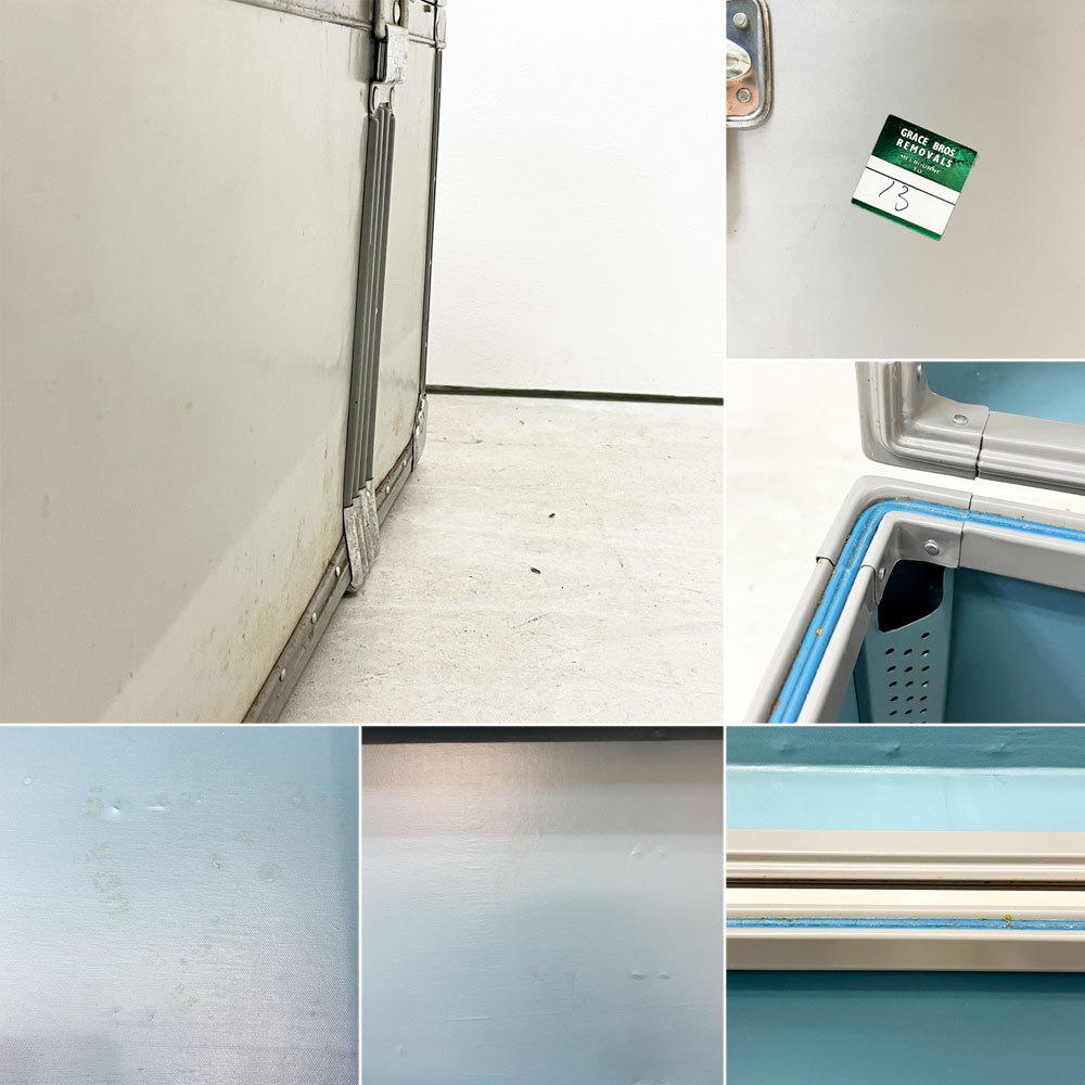 こちらは、ビンテージのお品物です。使用・経年に伴い、傷や擦れ、打痕やクスミ、錆、内部には表面材の剥がれやペイントロス、裏面にやや目立つ凹み(画像10枚目参照)がございます。また、中央の鍵は欠品しており、錠も壊れている為、この部分の固定はできません。経年なりの使用感はございますが、ビンテージ品の風合いとして楽しみつつ、今後もご使用いただけるコンディションを保っております。