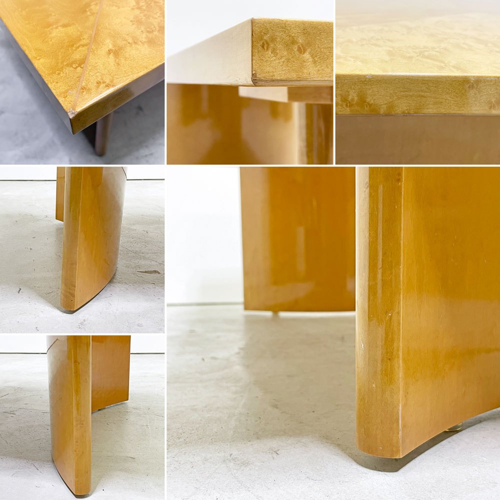 また天板は「マス張り」と呼ばれるX状にクロスさせ突き板を張り合わせる高度な加工技術を採用。バーズアイの有機的な表情に対して、直線構成がモダンな印象を強調させています。天板表面にはバーズアイメープルの神秘的な美しさを一層引き立たせる艶やかなコーティングを施し、高級感を漂わせています。