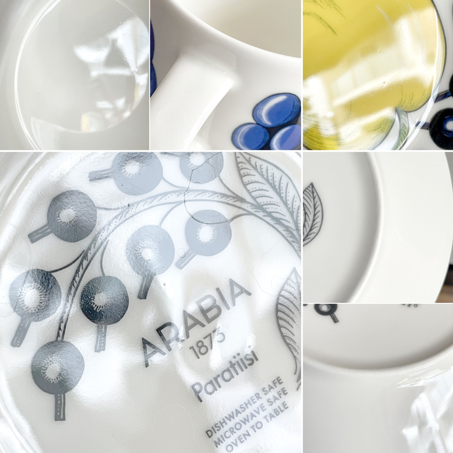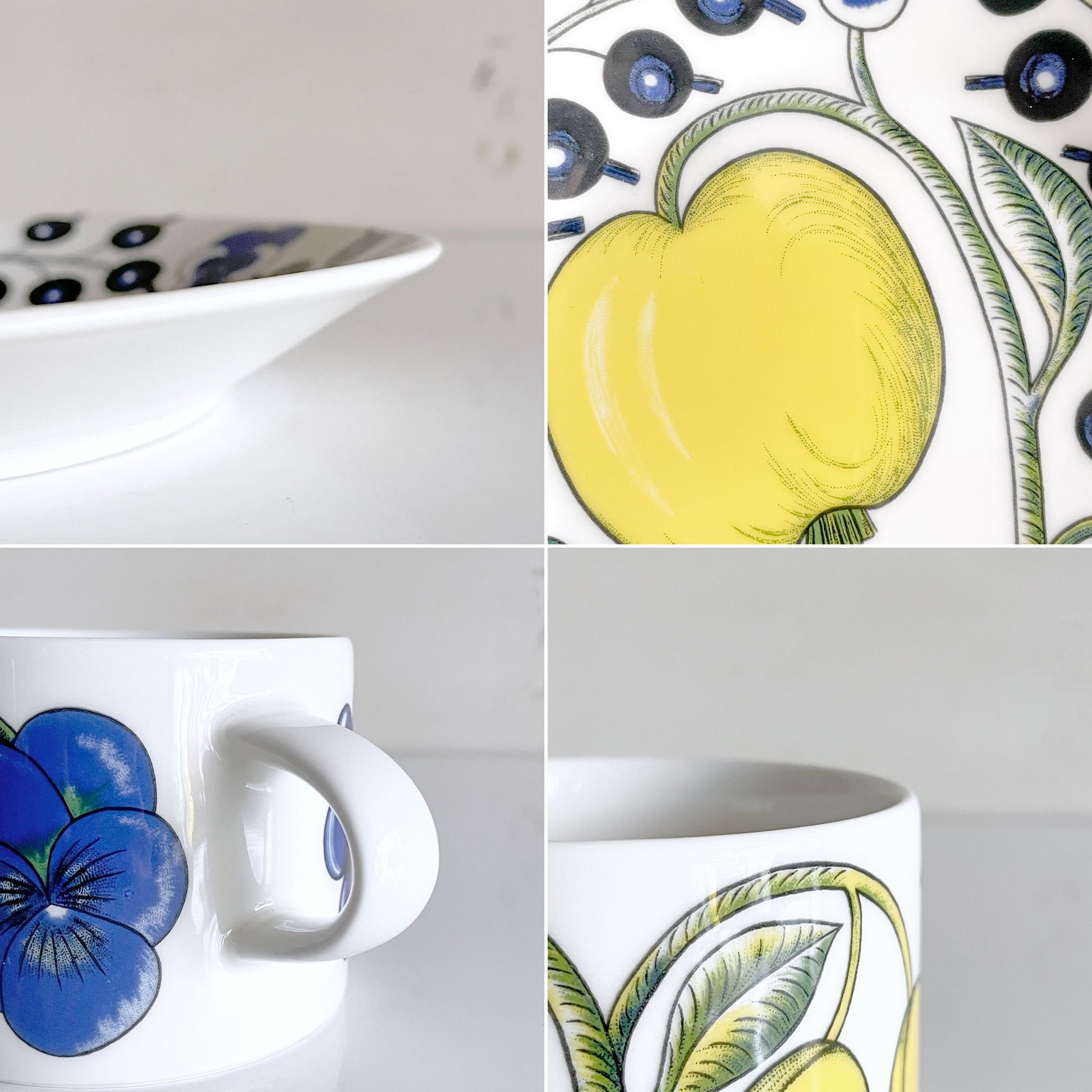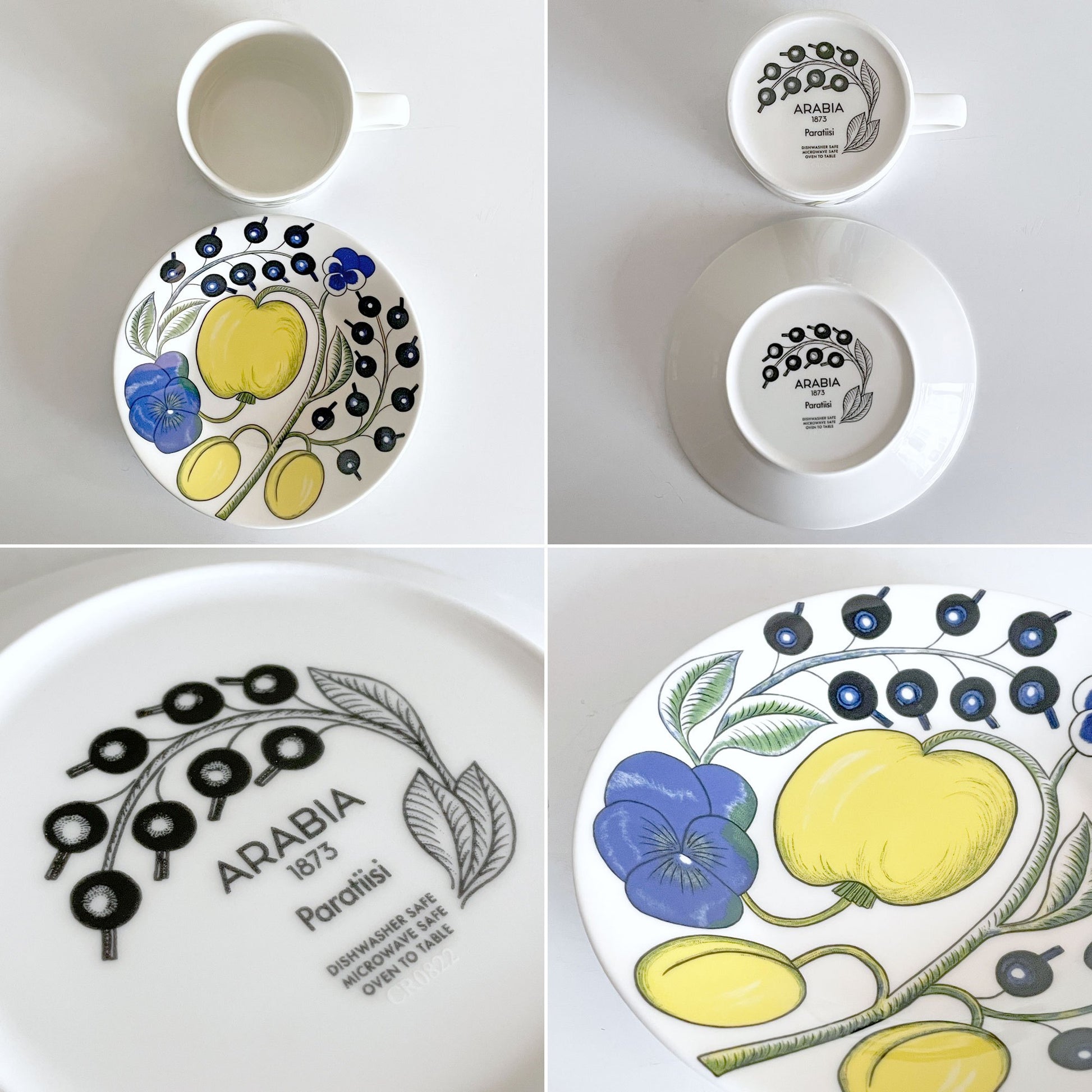 フィンランド語で「楽園」を意味する「Paratiisi」の名の通り、ブドウやリンゴ、プラムなどの果物や、カシス、パンジーなどの植物が器いっぱいに描かれています。