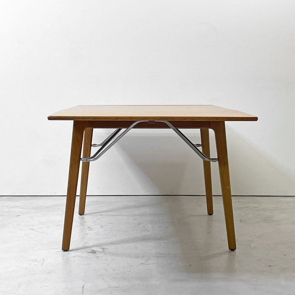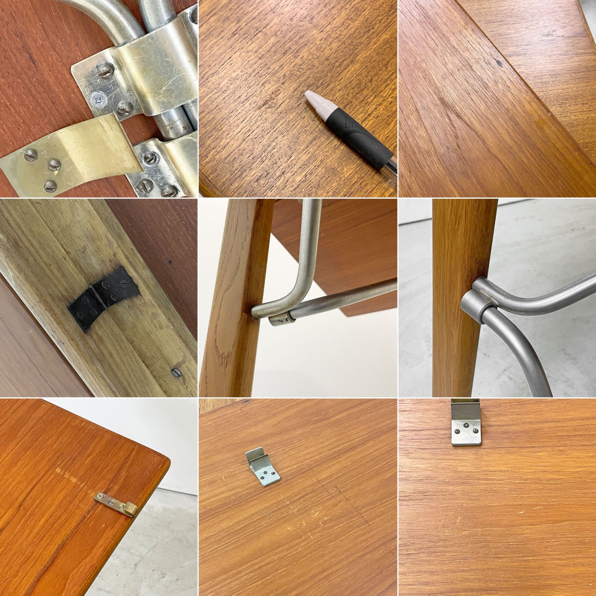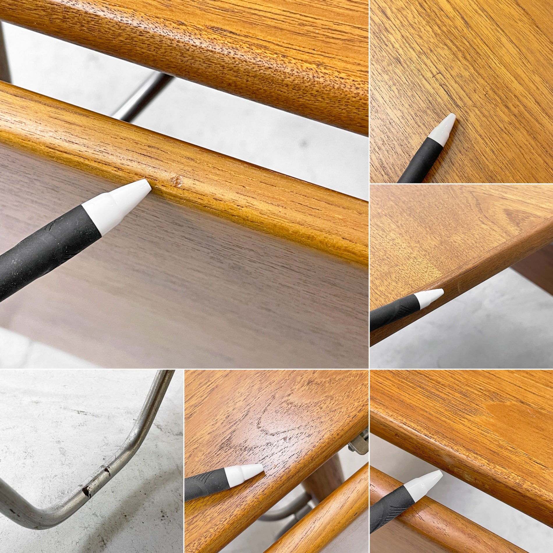 赤みを帯びたブラウン色の希少木材チーク材とはっきりした木目が特徴のオーク材を組み合わせ、ツートンカラーによる心地良いハーモニーを生み出す木製テーブル。当時としては珍しく、金属フレームを組み合わせたメリハリのある面持ちは、現代のモダン空間とも調和する表情豊かな構成です。
