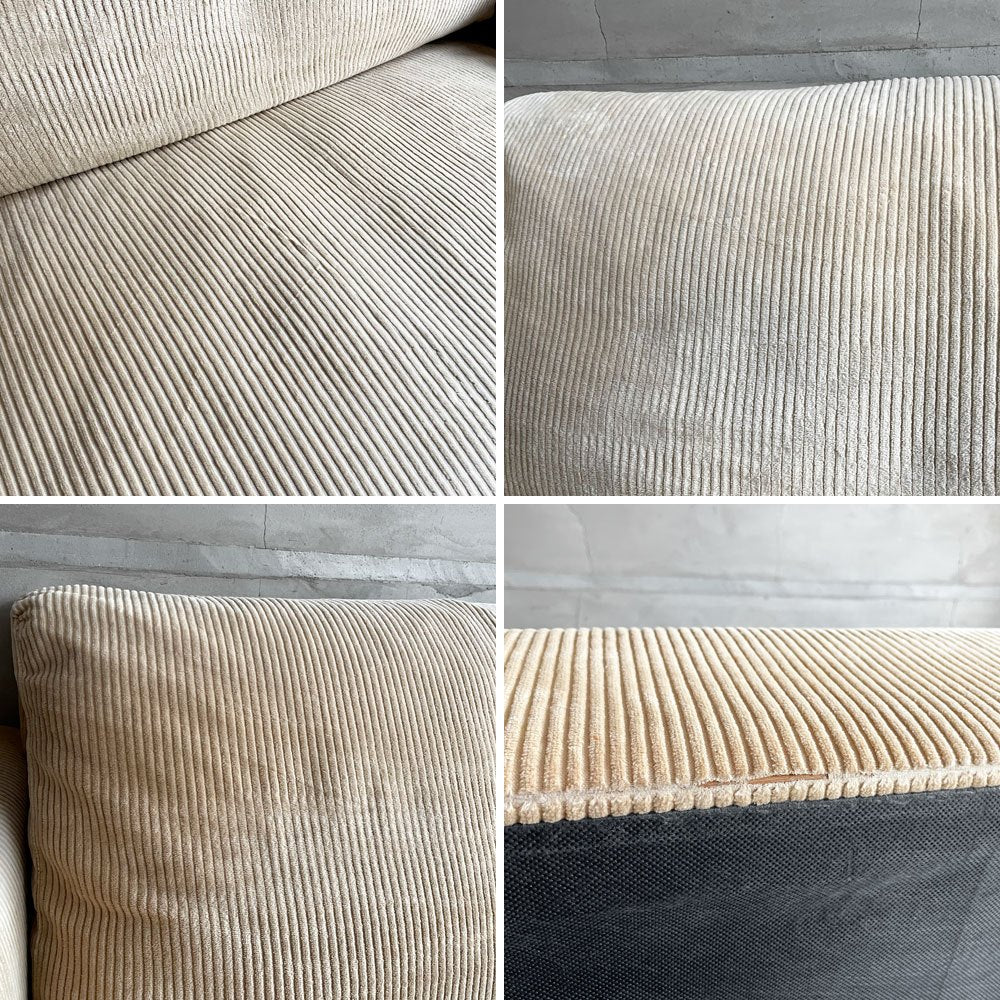 脚部の軽微な傷や汚れ、ファブリックの擦れや若干の染み汚れ、色ムラや日焼けによる変色、起毛のクセなどが見受けられますが、大きく美観を損なうようなダメージではなく、太畝コーデュロイ生地特有の風合いとしてお楽しみ頂けるかと思います。また、ソファ底面付近のファブリックに4.5cmほどの破れが見受けられます普段は見えない箇所となります。その他、クッションのヘタリなども無く、ビンテージ感のあるマスタード生地ならではの風合いをお楽しみ頂きながら、これからも安心してお使い頂けるコンディションを保っております。
