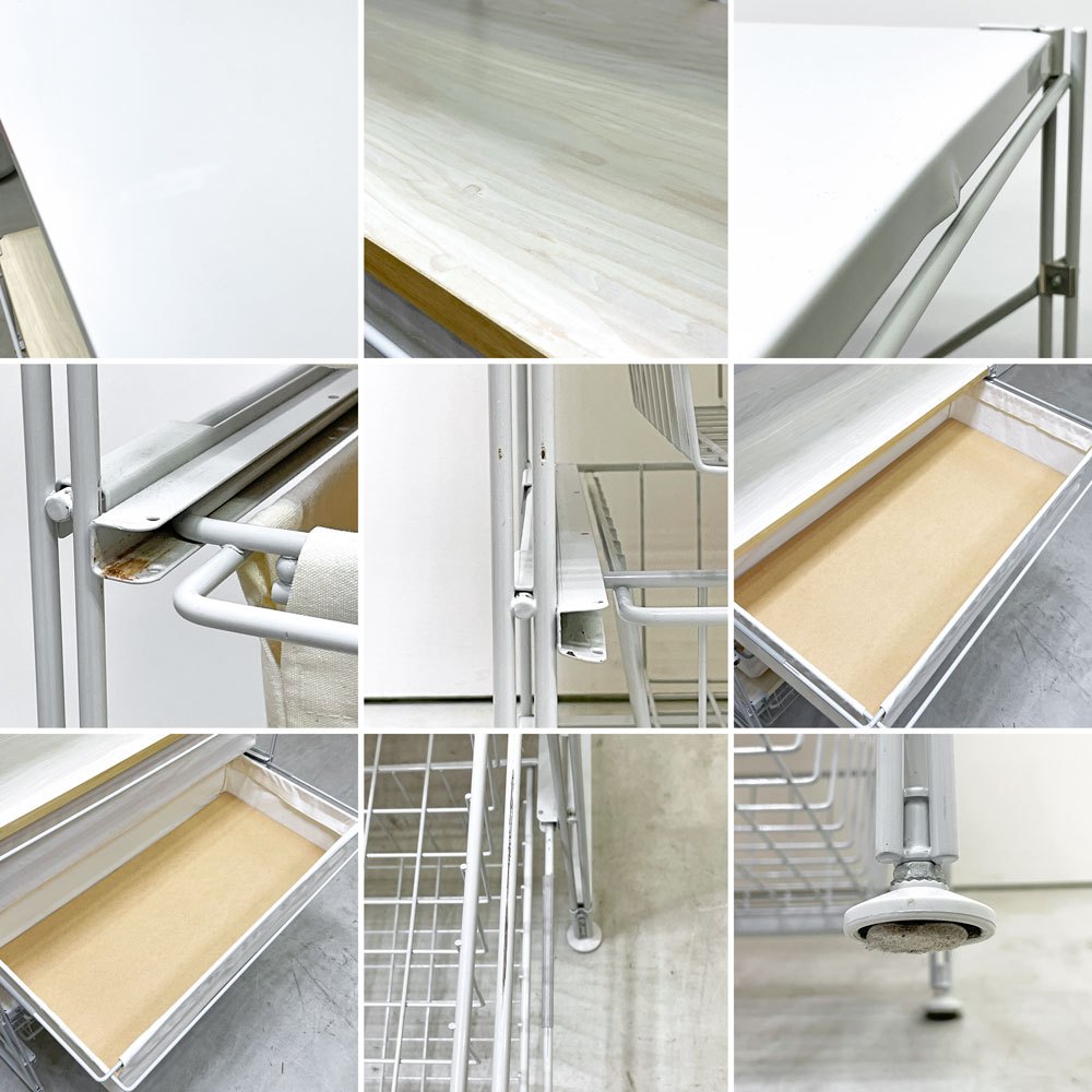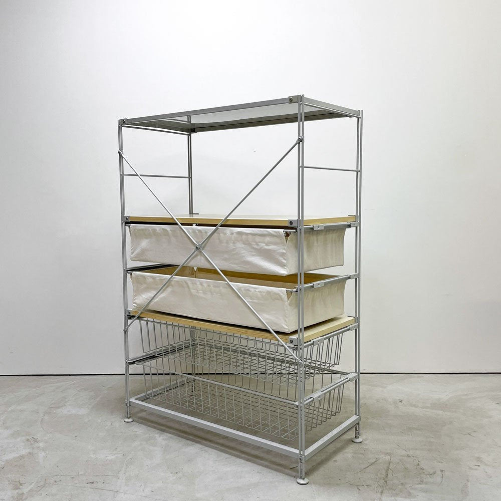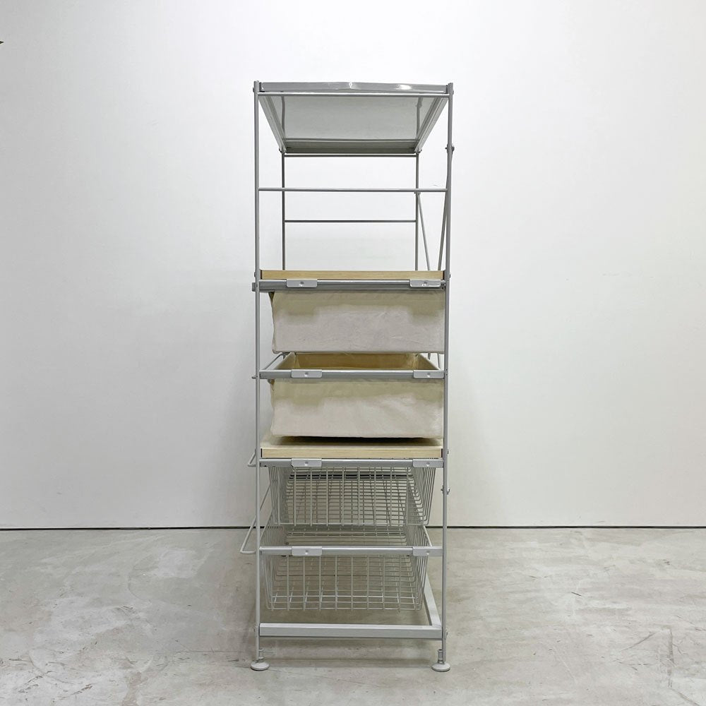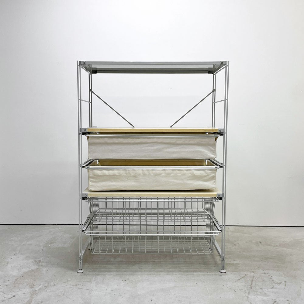 こちらは木製棚板に加え、帆布、ワイヤーバスケットをそれぞれ2杯ずつ備えた仕様。