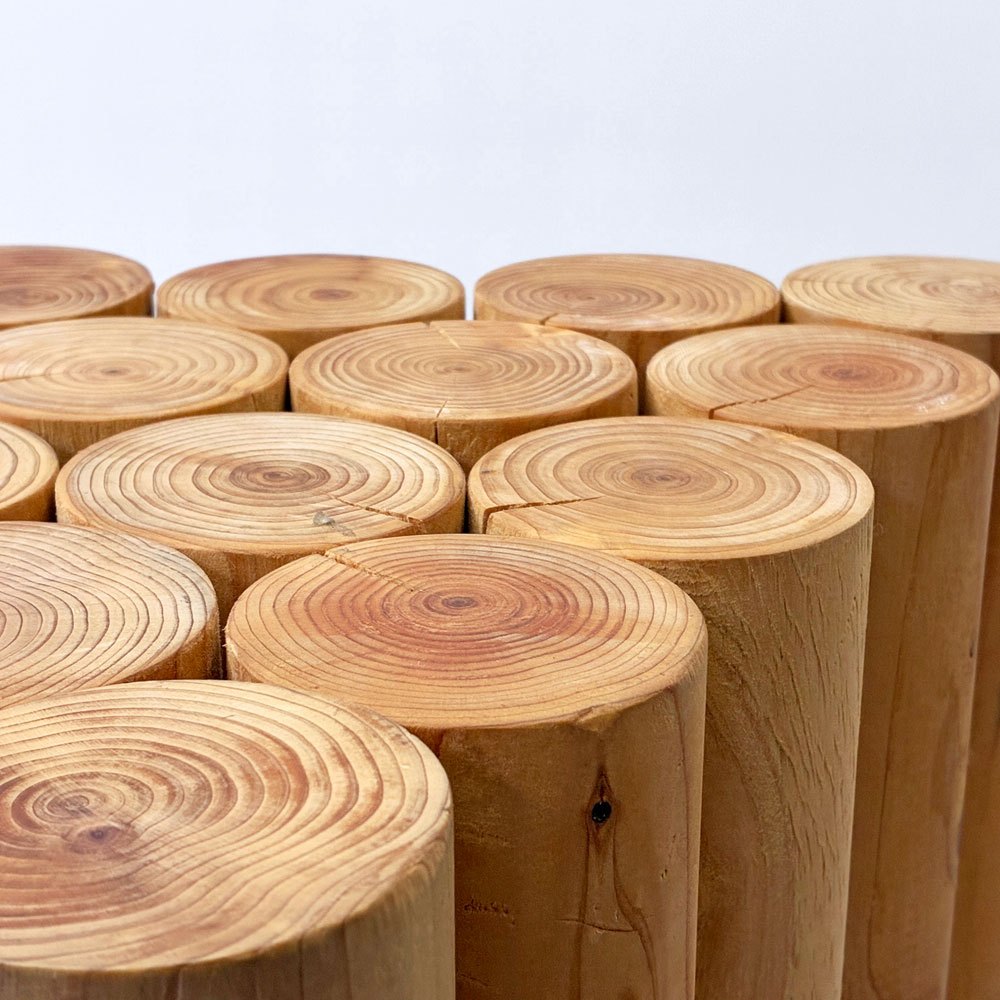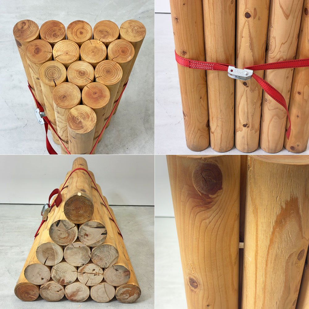 丸太同士は木ダボで繋げられている為、ズレたりせずに確りと三角形のフォルムを保っています。思わず手で撫でてしまう心地良い木肌。また木目や木の節等、木材本来の表情を残し、自然共に生活していると分かる安心感を与えてくれます。