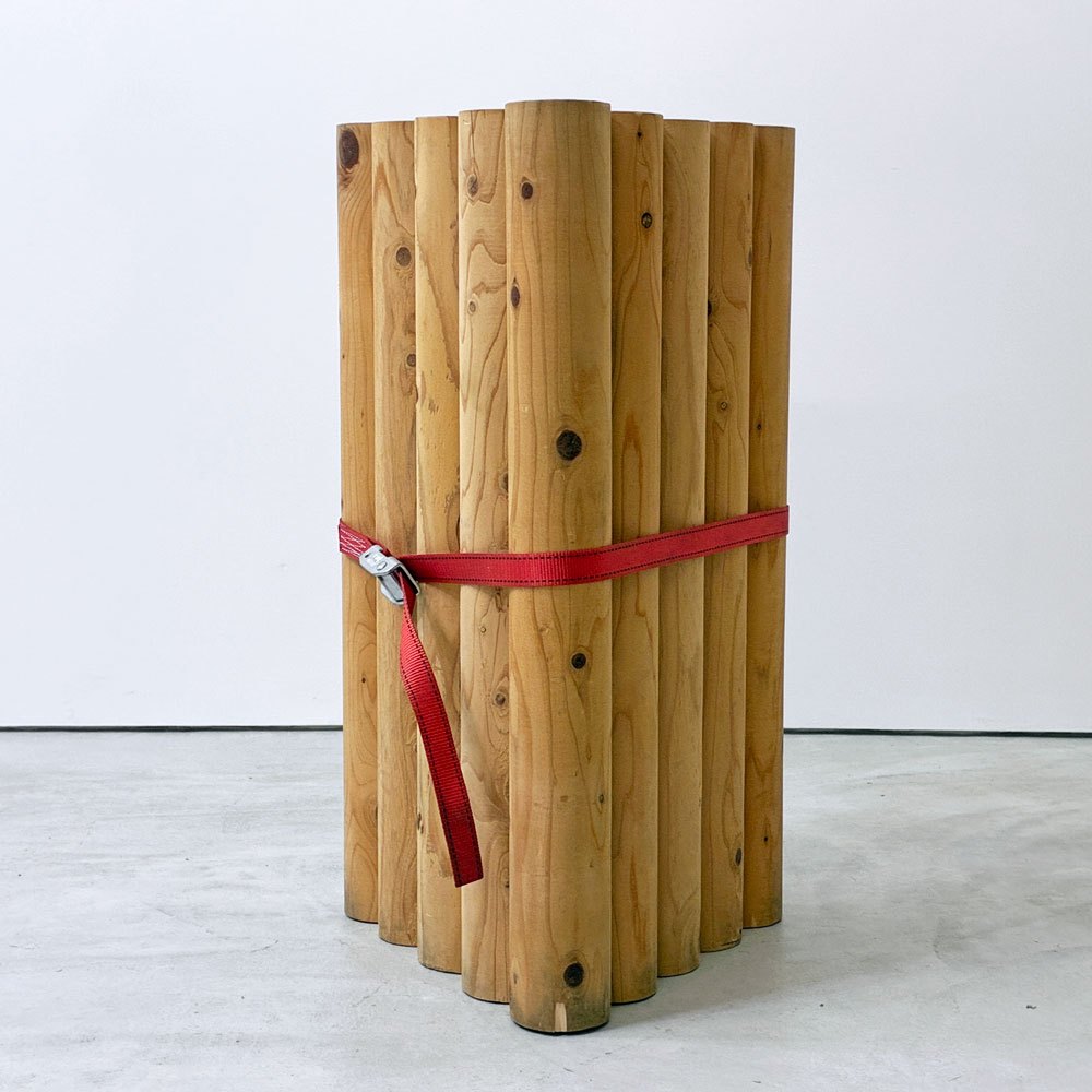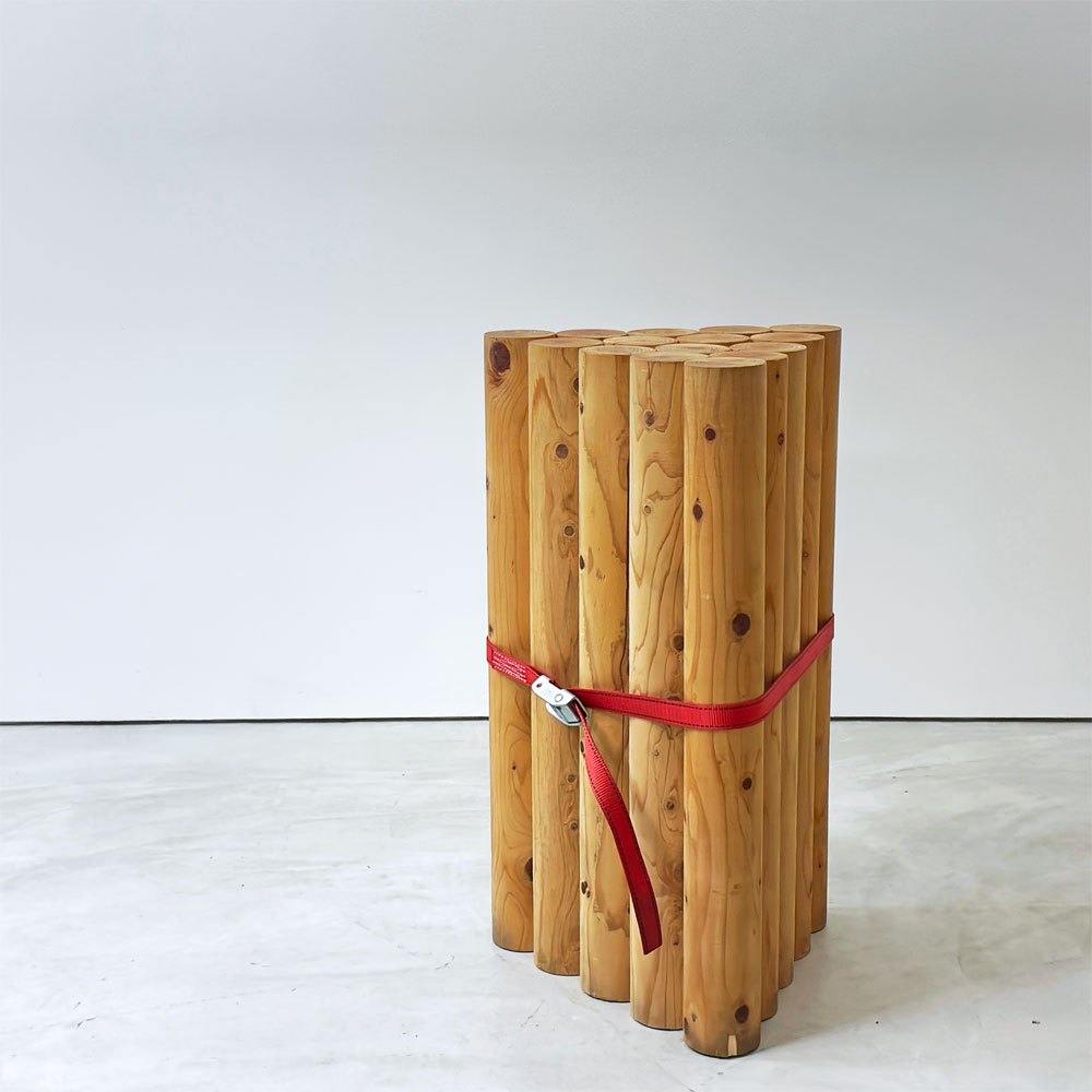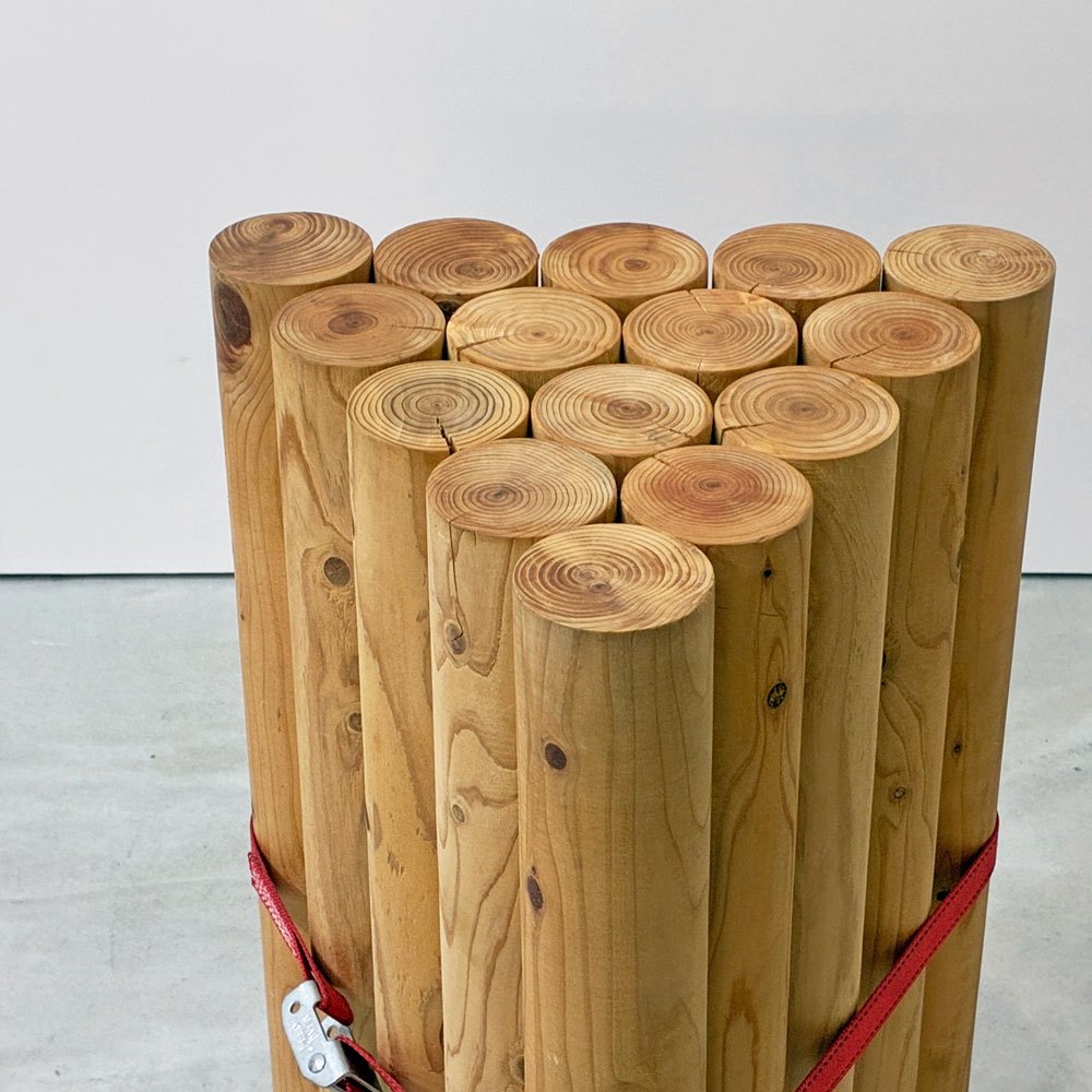 綺麗に製材された直径8cmの丸太15本を組み合わせ、荷積みの固定で使用するラッシングベルトが巻かれたユニークなデザインの無垢材テーブル。