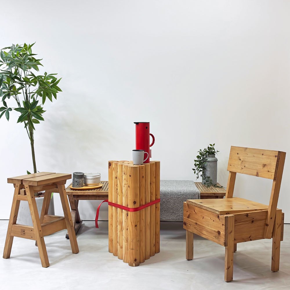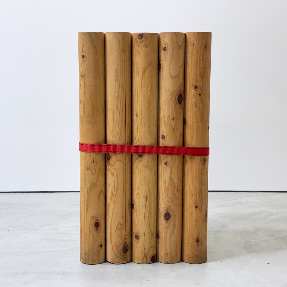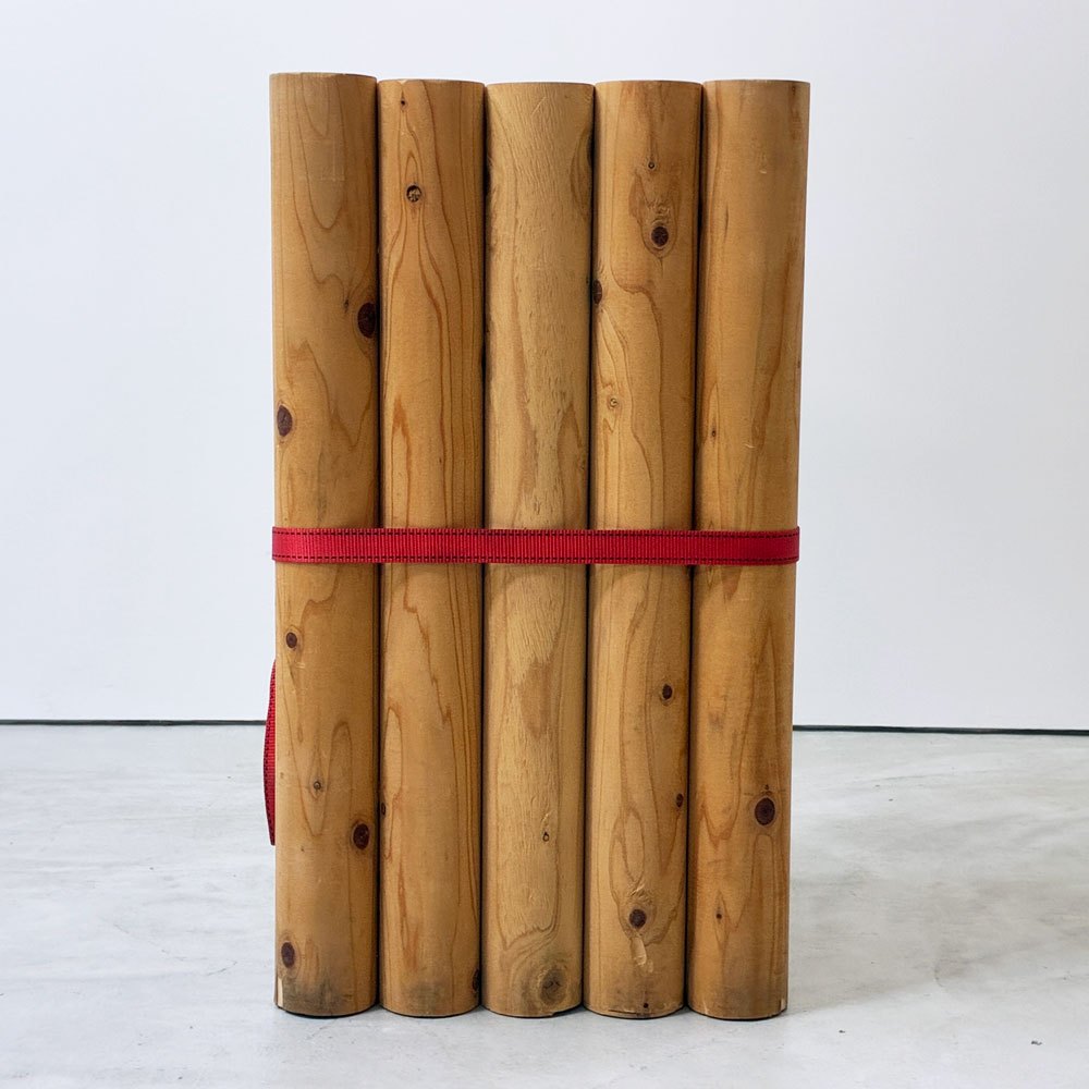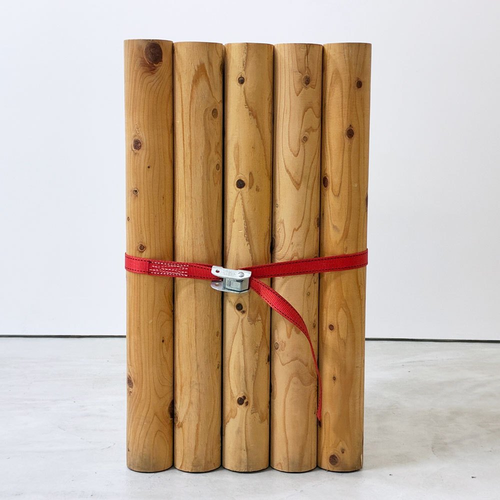 綺麗に製材された直径8cmの丸太15本を組み合わせ、荷積みの固定で使用するラッシングベルトが巻かれたユニークなデザインの無垢材テーブル。