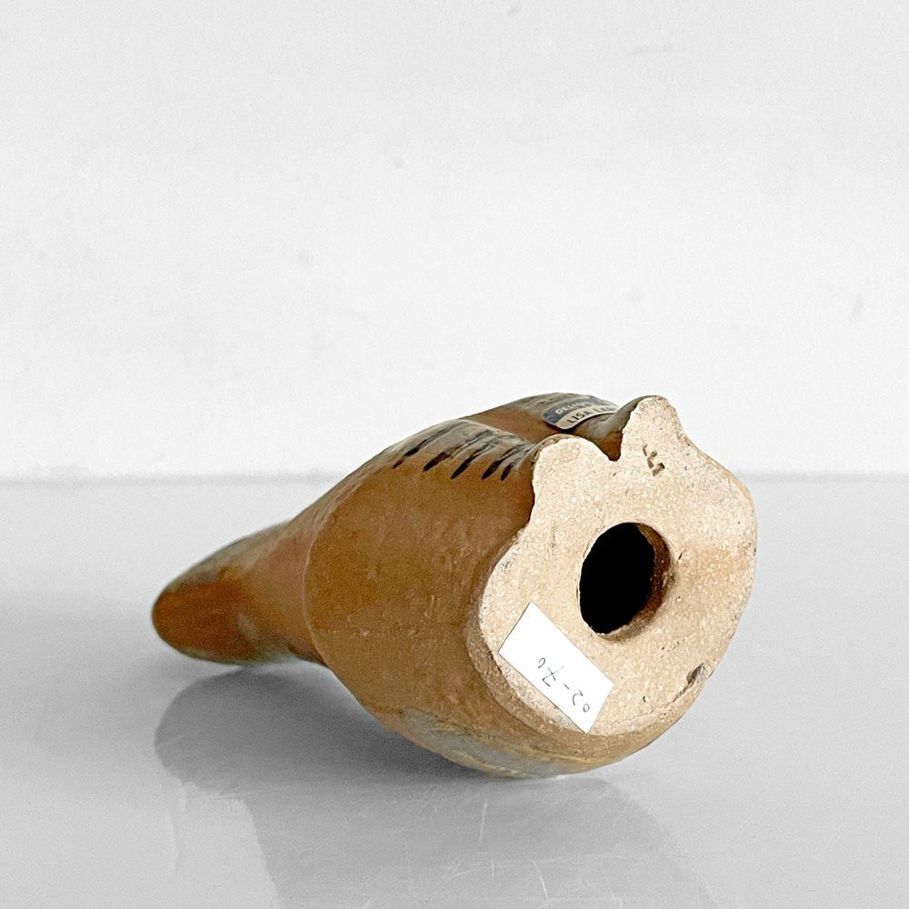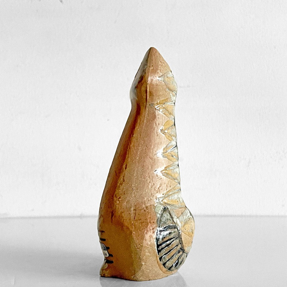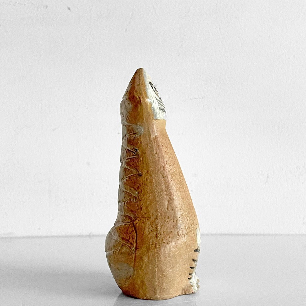 素焼きのボディにやや白い釉薬をまとった顔が際立ち、少し微笑んでいるような表情でこちらを見つめる魅惑の1体。目を見開きしゃきっと背筋を伸ばしたその姿、背中のしっぽのくるんと上にあげた感じが、何度見ても見飽きない、ネコ好きにはたまらない一品となっております。