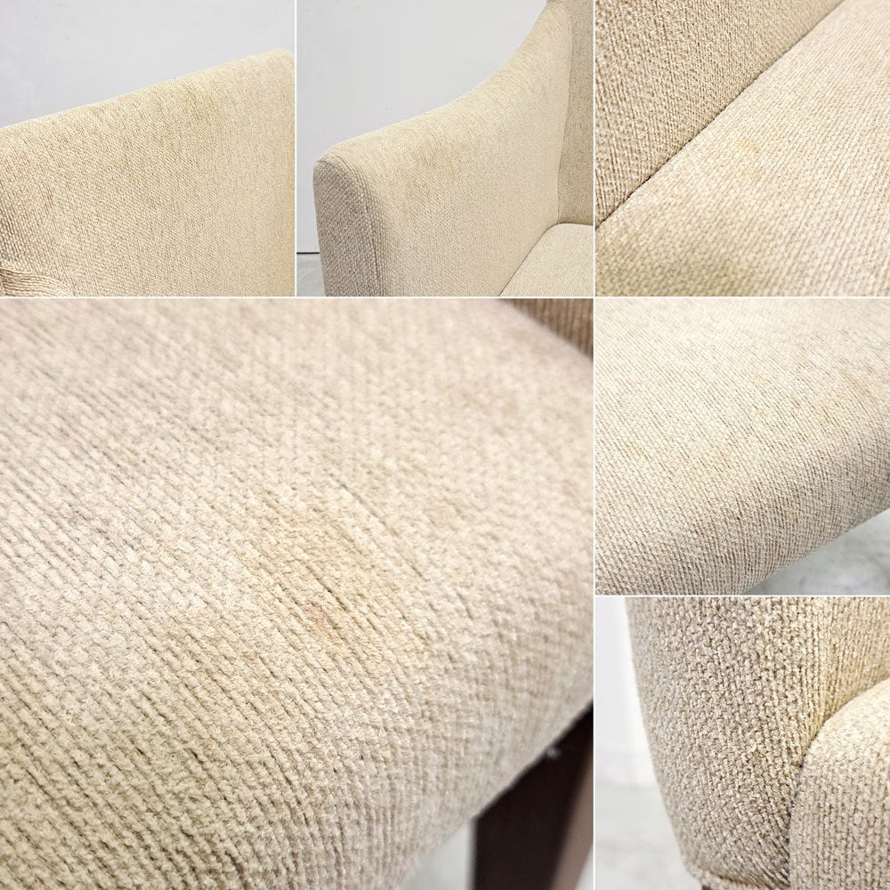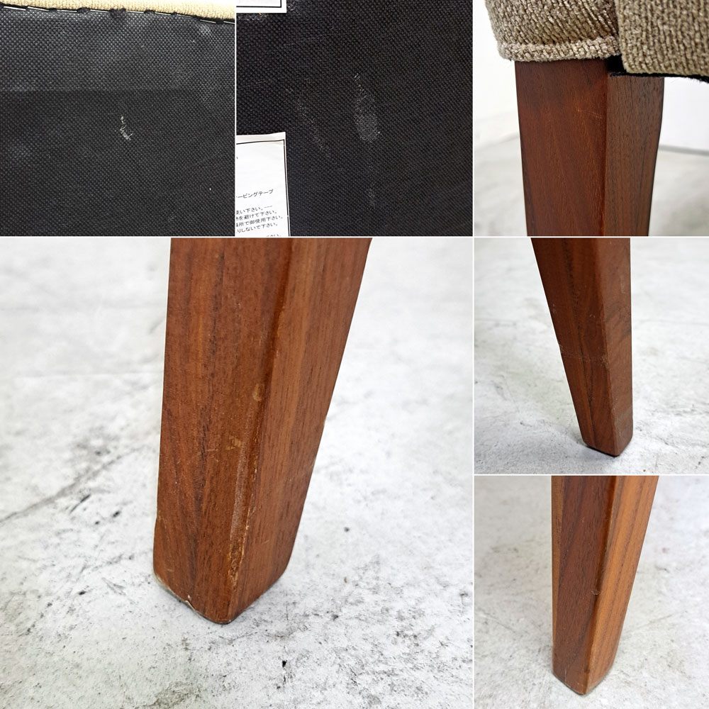 使用に伴い、木部フレームには軽微な擦れや小傷、打痕が散見され、ファブリックには取り切れないシミが複数見受けられます。やや使用感はございますが、ガタつきやグラつきなど機能を大きく損なうダメージは無く、これからも十分に実用いただけるコンディションを保っております。