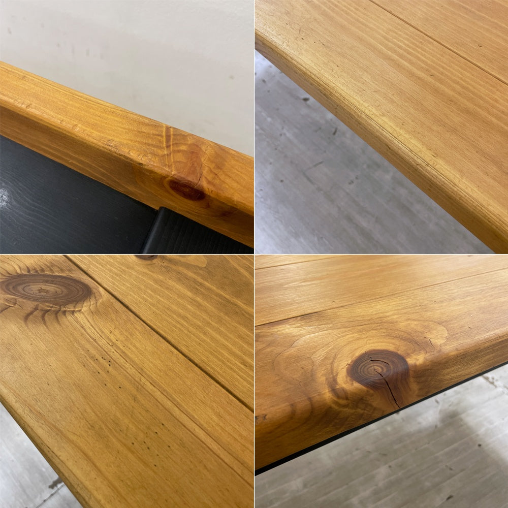 使用に伴い、傷や擦れ、打痕、黒い点状の穴、脚部には傷や擦れ、打痕がございます。その他、ガタツキやグラつきなど使用に問題となるダメージはございません。数ヶ所に木材特有の節が見られますが、天然木ならではの風合いを楽しみながらお使いいただけるコンディションを保っております。