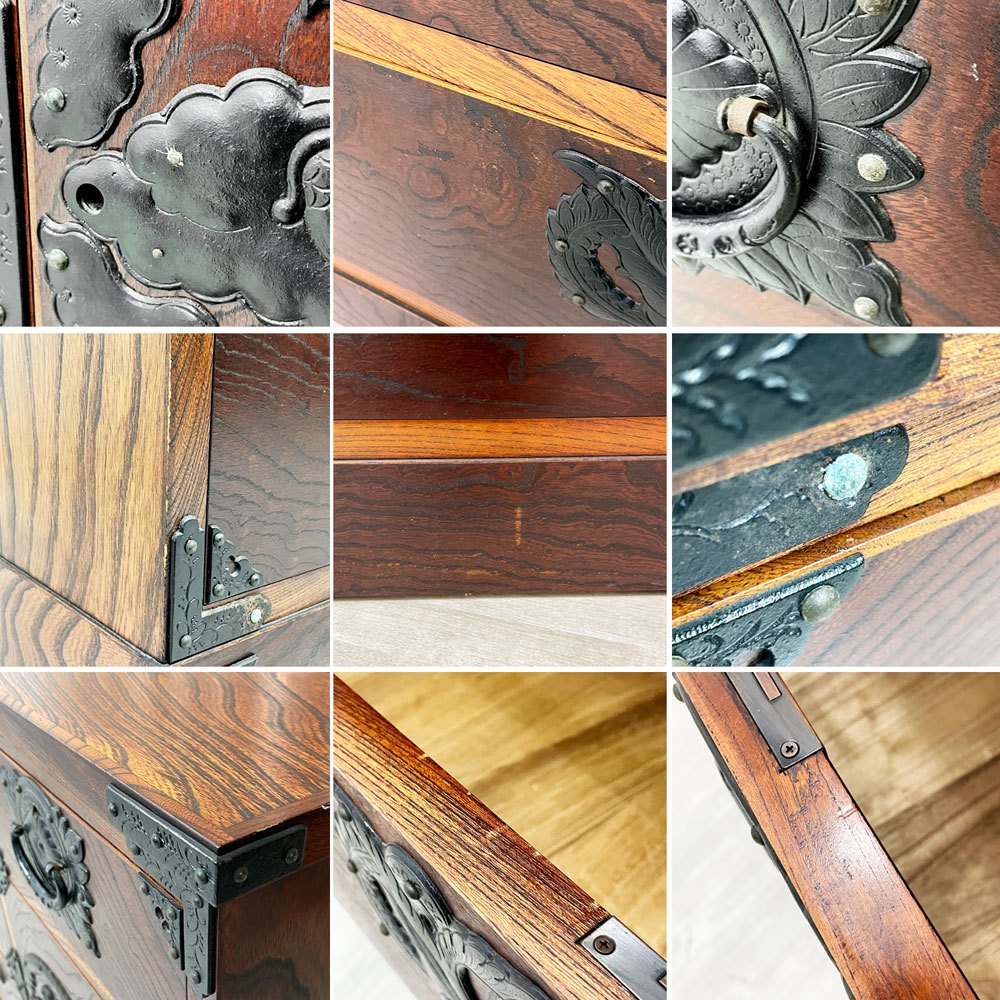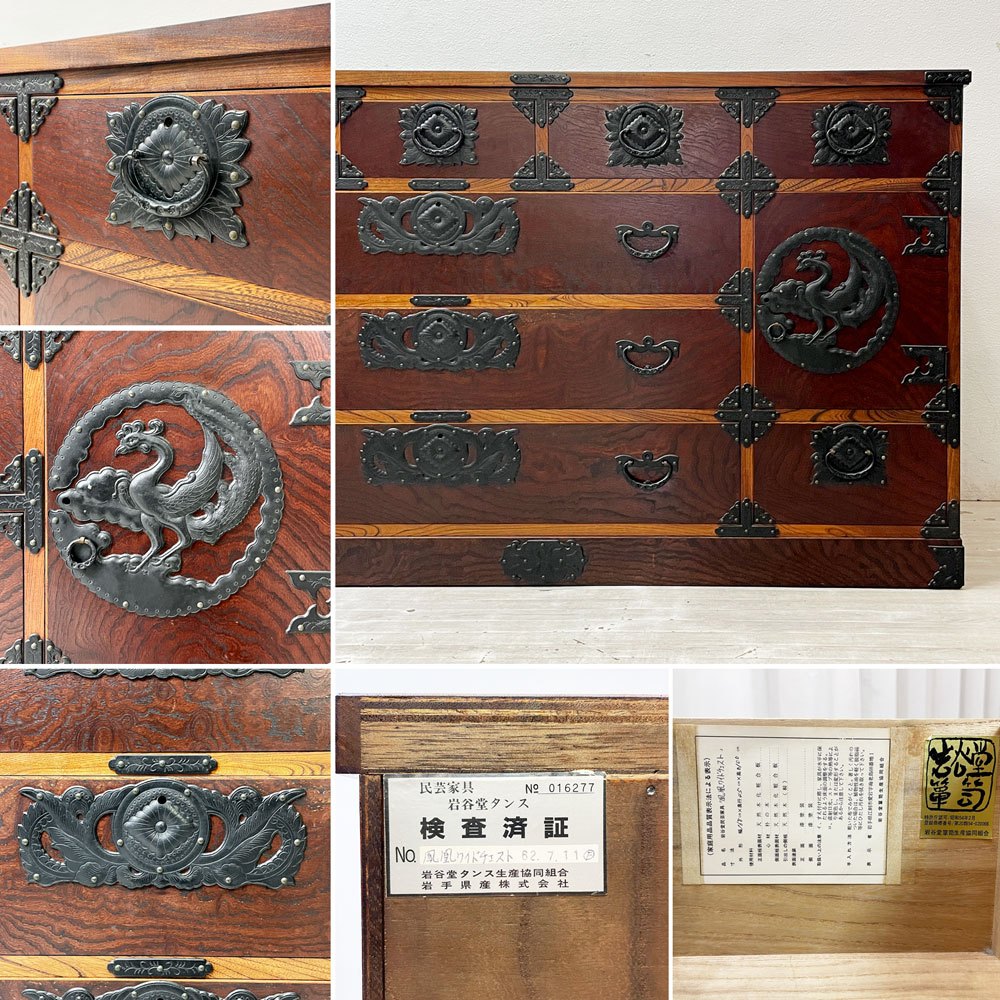 岩谷堂箪笥 鳳凰 六尺整理箪笥 ワイドチェスト 欅 拭漆 南部鉄器 伝統工芸 民芸家具 W169cm 鍵欠品 和家具 ●