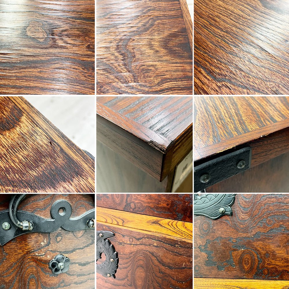 使用に伴い、傷や擦れ、打痕や色ムラ、ペイントロスや抽斗内部の僅かな線傷、鉄器部分の錆汚れやクスミが見られます。また、天板は湿気により表面の割れや浮きがございます。なお、抽斗の鍵は欠品となります。その他、実用に問題となるダメージは無く、これからも安心してご使用いただけるコンディションを保っております。