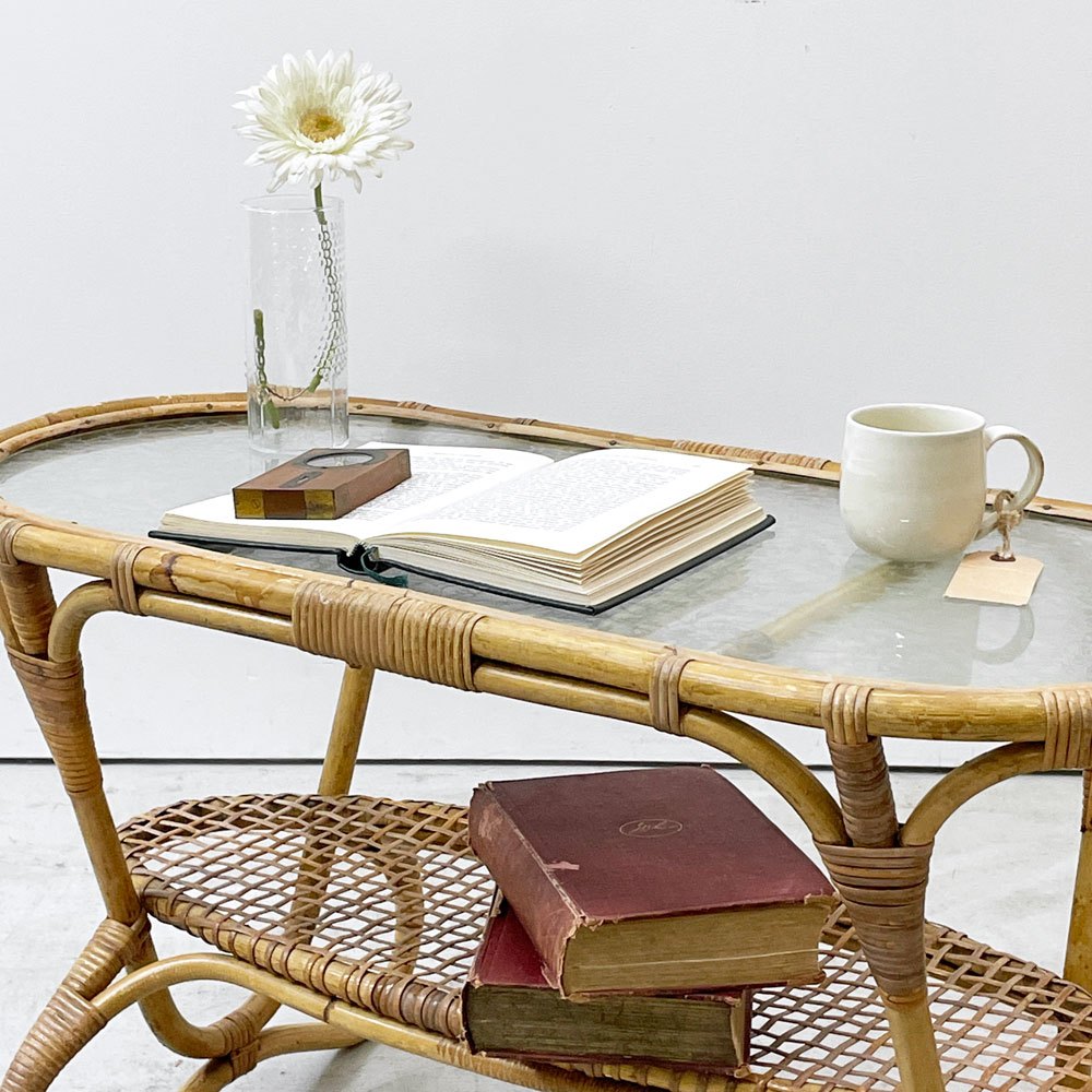 UKビンテージ ガラストップ ラタン コーヒーテーブル