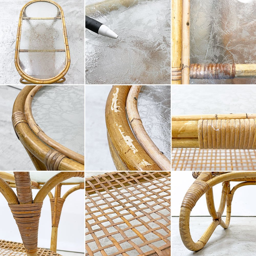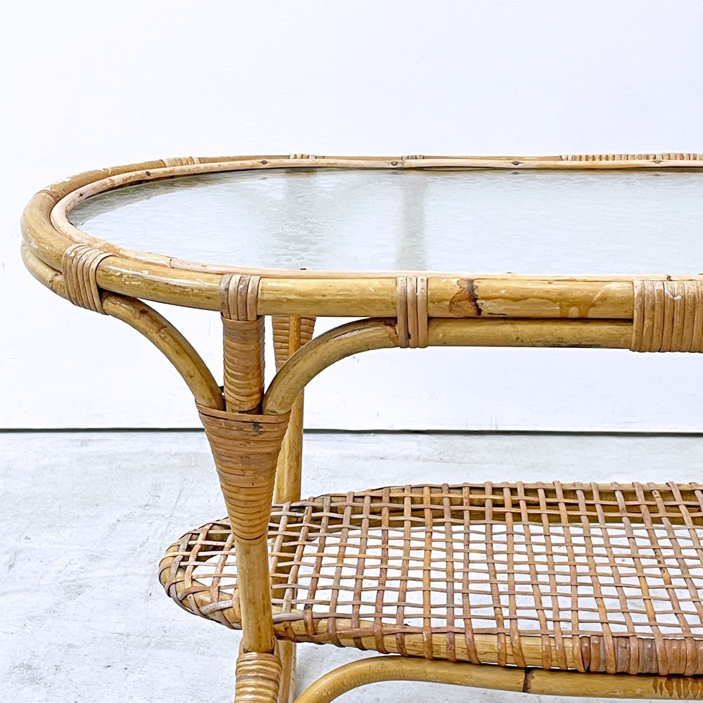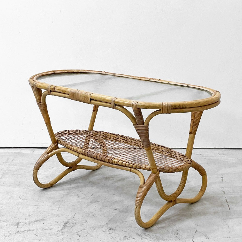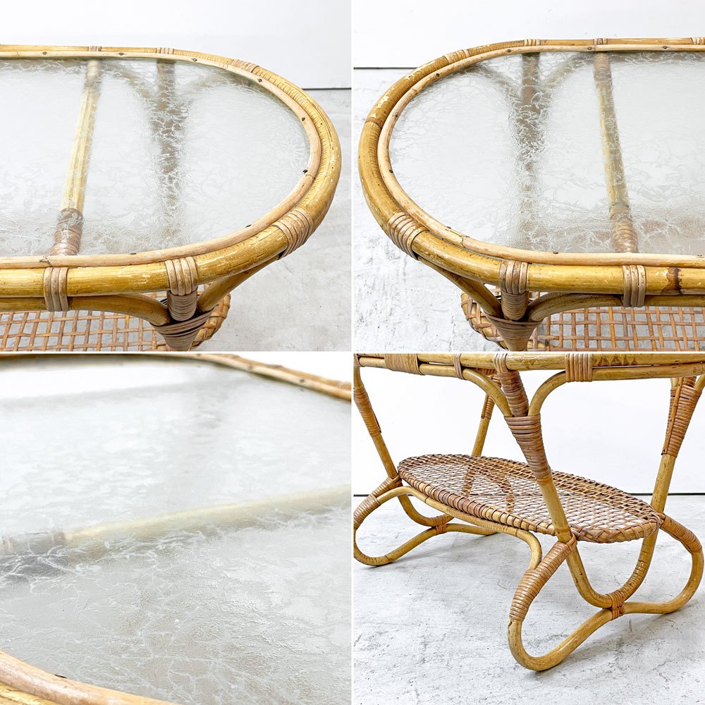 UKビンテージ Vintage ガラストップ ラタン コーヒーテーブル オーバル エッチングガラス ラック付き アンティーク 英国家具 ●
