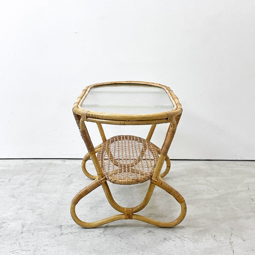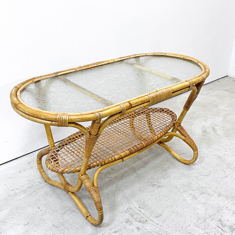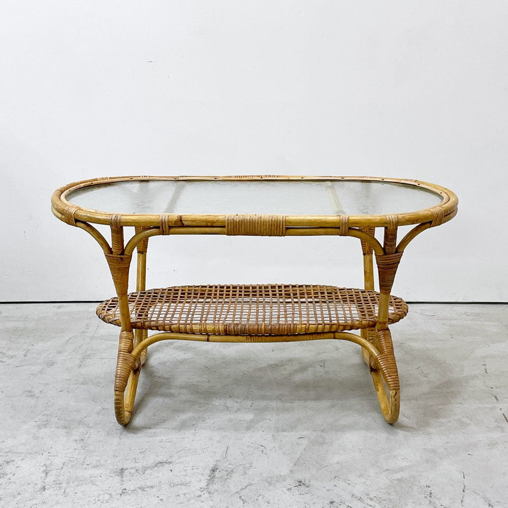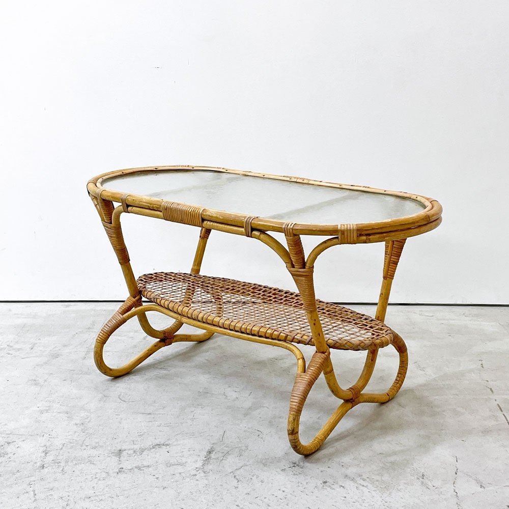 UKビンテージ Vintage ガラストップ ラタン コーヒーテーブル オーバル エッチングガラス ラック付き アンティーク 英国家具 ●