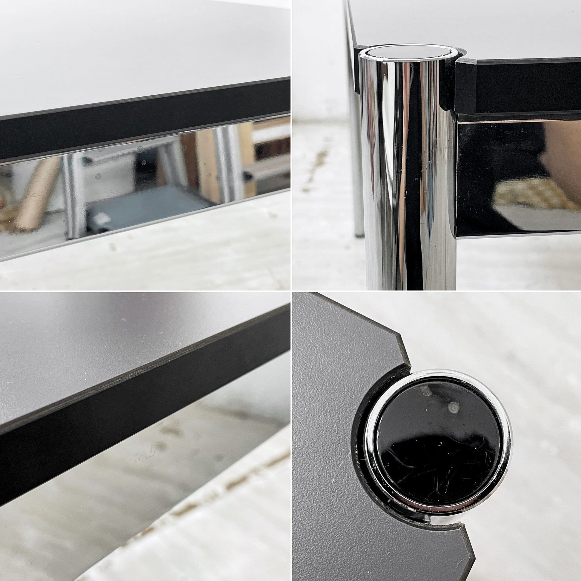 使用に伴い、細かな擦れや小傷、天板に光の角度で見える輪染みが二箇所、クロームフレームに僅かに落とし切れない錆び汚れがございますが全体的に大きく美観を損なう程のダメージはございません。